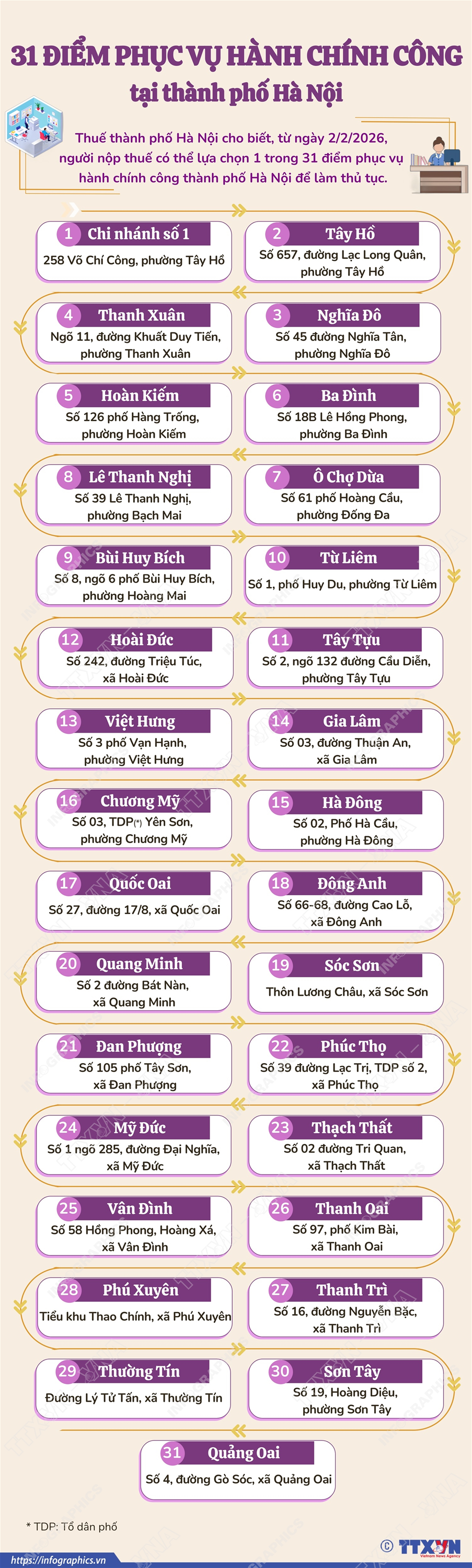 Hà Nội (TTXVN 3/2) Thuế thành phố Hà Nội cho biết, từ ngày 2/2/2026 sẽ tiếp nhận và giải quyết thủ tục hành chính thuế, hồ sơ được tiếp nhận theo hình thức phi địa giới hành chính, người nộp thuế có thể lựa chọn tại 1 trong 31 điểm phục vụ hành chính công thành phố Hà Nội để nộp thủ tục hành chính.