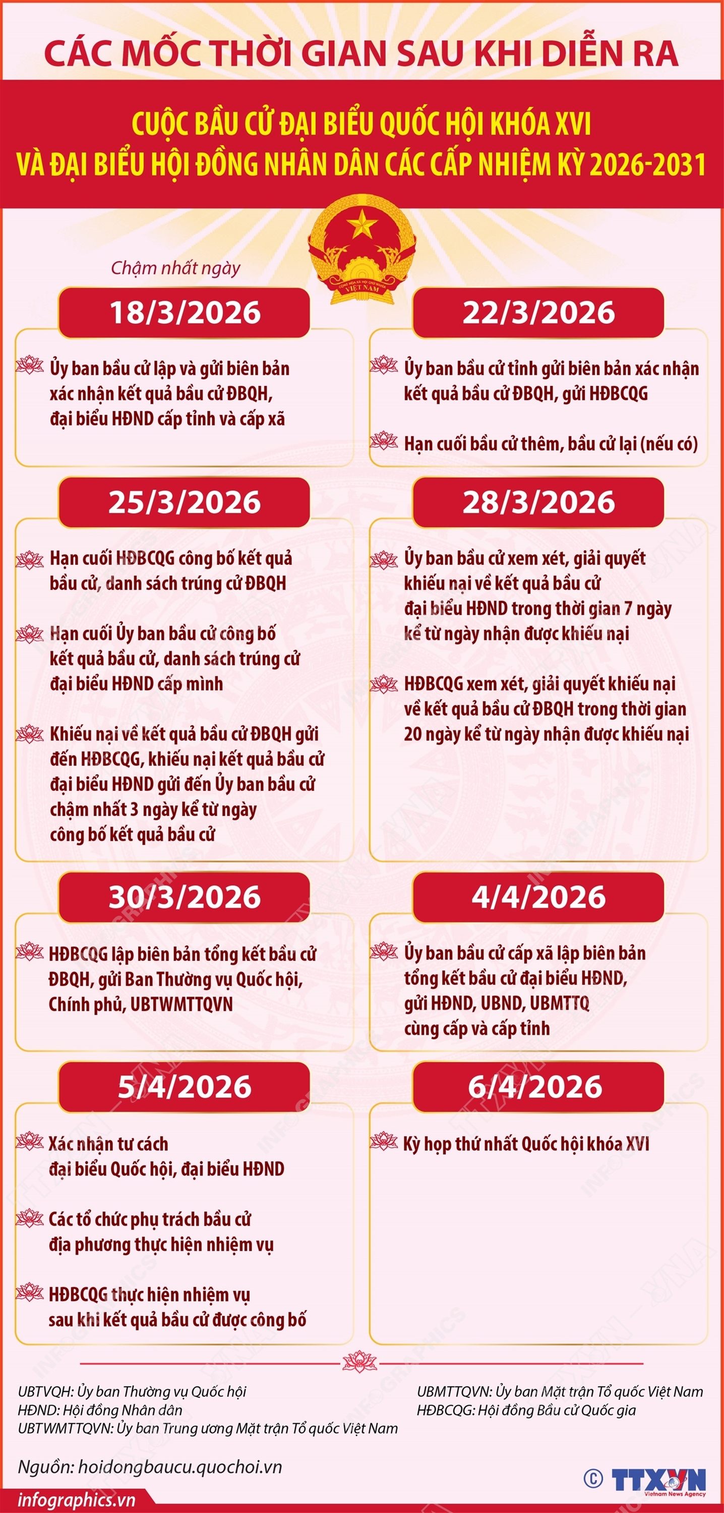 Hà Nội (TTXVN 16/3) Ngày 15/3/2026, cử tri cả nước đã đi bầu cử đại biểu Quốc hội khóa XVI và đại biểu Hội đồng nhân dân các cấp nhiệm kỳ 2026-2031, lựa chọn những người tiêu biểu, xứng đáng, đại diện cho ý chí, nguyện vọng và quyền làm chủ của nhân dân. Sau ngày bầu cử, Hội đồng Bầu cử Quốc gia và Ủy ban Bầu cử các địa phương tiếp tục triển khai nhiều công việc quan trọng để hoàn tất quy trình bầu cử theo đúng quy định của pháp luật, đảm bảo kết quả phản ánh trung thực ý chí và nguyện vọng của cử tri. TTXVN trân trọng giới thiệu một số mốc thời gian qua trọng sau khi diễn ra cuộc bầu cử ĐBQH khóa XVI và đại biểu HĐND các cấp nhiệm kỳ 2026-2031.
