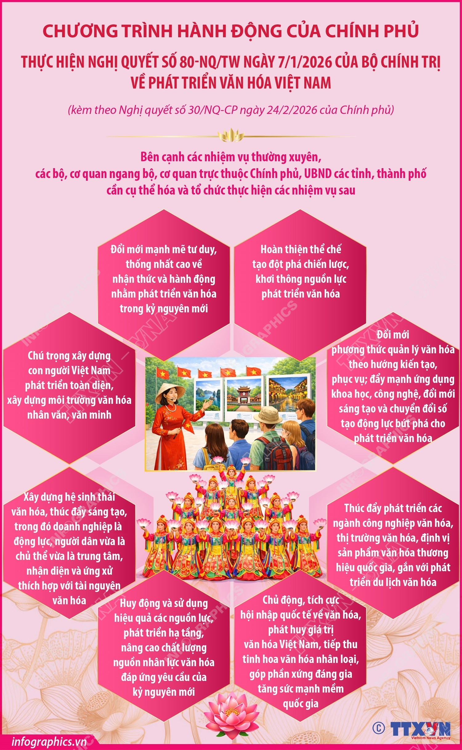 Hà Nội (TTXVN 26/2) Chương trình hành động của Chính phủ thực hiện Nghị quyết số 80-NQ/TW ngày 7/1/2026 của Bộ Chính trị về phát triển văn hóa Việt Nam (kèm theo Nghị quyết số 30/NQ-CP ngày 24/2/2026 của Chính phủ) xác định nhiệm vụ cụ thể để các bộ, ngành, địa phương xây dựng kế hoạch hành động, tổ chức triển khai đồng bộ, kiểm tra, giám sát, đánh giá việc thực hiện Nghị quyết số 80-NQ/TW, phát triển văn hóa thực sự trở thành nền tảng vững chắc và sức mạnh nội sinh của dân tộc, vừa góp phần phát triển nhanh, bền vững, hướng đến mục tiêu 100 năm thành lập Đảng và 100 năm thành lập nước, vừa hình thành nền văn hóa xứng tầm một quốc gia phát triển, định hướng xã hội chủ nghĩa, có truyền thống văn hóa, văn hiến rực rỡ ngàn đời, đóng góp xứng đáng vào dòng chảy văn minh nhân loại. Theo Chương trình hành động của Chính phủ thực hiện Nghị quyết số 80-NQ/TW, bên cạnh các nhiệm vụ thường xuyên, các bộ, cơ quan ngang bộ, cơ quan trực thuộc Chính phủ, UBND các tỉnh, thành phố cần cụ thể hóa và tổ chức thực hiện tốt các nhiệm vụ đề ra.