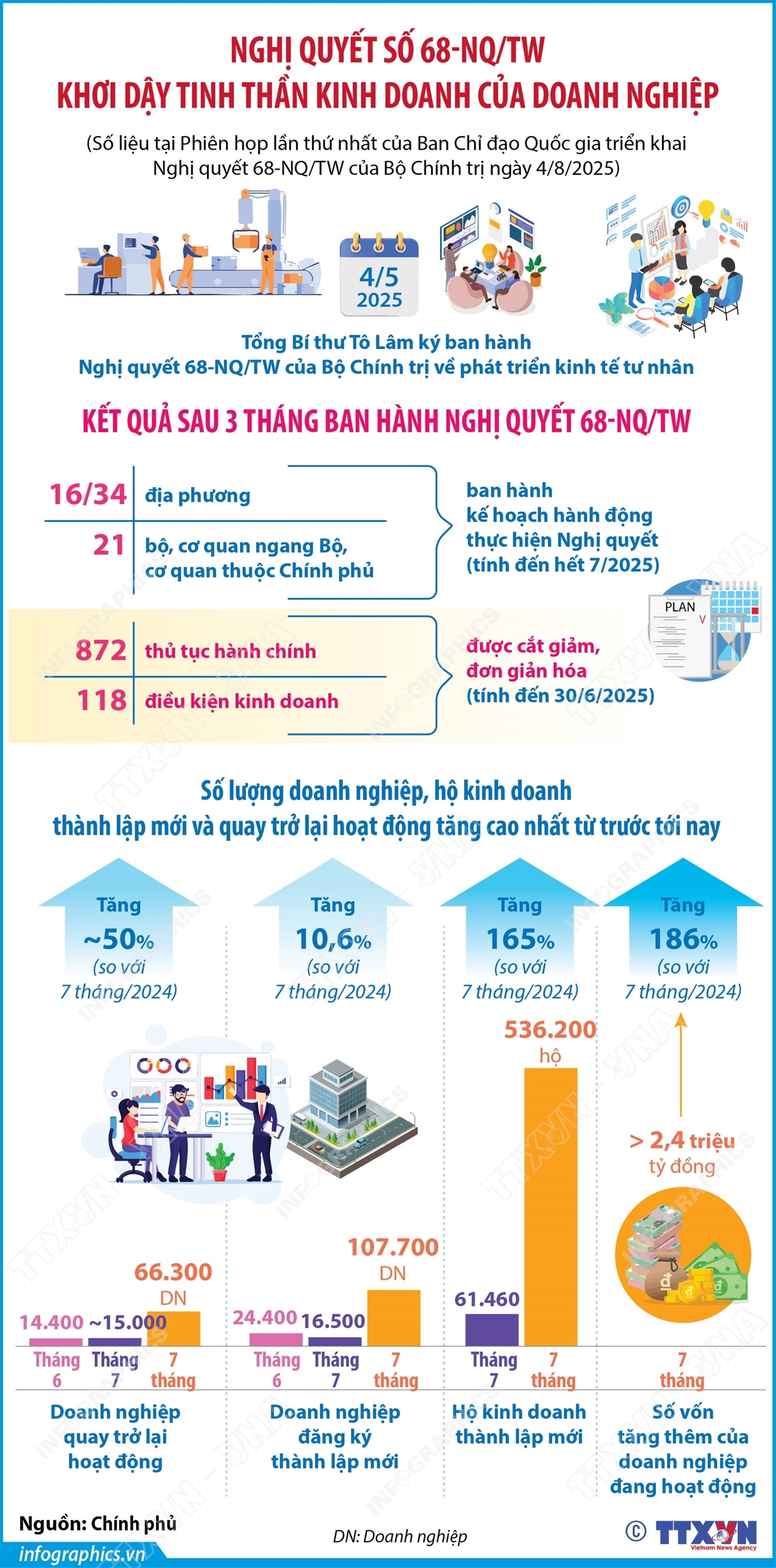 Hà Nội (TTXVN 6/8) Ngày 4/8/2025, tại Trụ sở Chính phủ, Thủ tướng Phạm Minh Chính - Trưởng ban Chỉ đạo Quốc gia triển khai Nghị quyết 68-NQ/TW của Bộ Chính trị về phát triển kinh tế tư nhân chủ trì Phiên họp lần thứ nhất của Ban Chỉ đạo. Sau 3 tháng triển khai, Nghị quyết 68 đã thực sự khơi dậy tinh thần kinh doanh, giúp doanh nghiệp cảm thấy được khích lệ, đồng hành, lắng nghe. Tinh thần khởi nghiệp, lập nghiệp lên cao với số lượng doanh nghiệp, hộ kinh doanh thành lập mới và quay trở lại hoạt động tăng cao nhất từ trước tới nay, làn sóng khởi nghiệp gia tăng mạnh mẽ. Tháng 6/2025 ghi nhận cột mốc lịch sử khi số lượng doanh nghiệp thành lập mới đạt hơn 24,4 nghìn, tăng 60,5% so với cùng kỳ năm 2024, cao gấp 2 lần mức trung bình giai đoạn 2021 - 2024. Tháng 7/2025, cả nước có thêm hơn 16,5 nghìn doanh nghiệp đăng ký, đưa tổng số doanh nghiệp thành lập 7 tháng đầu năm lên 107,7 nghìn, tăng 10,6%; số vốn tăng thêm của doanh nghiệp đang hoạt động đạt hơn 2,4 triệu tỷ đồng, tăng hơn 186% so với cùng kỳ năm 2024.
