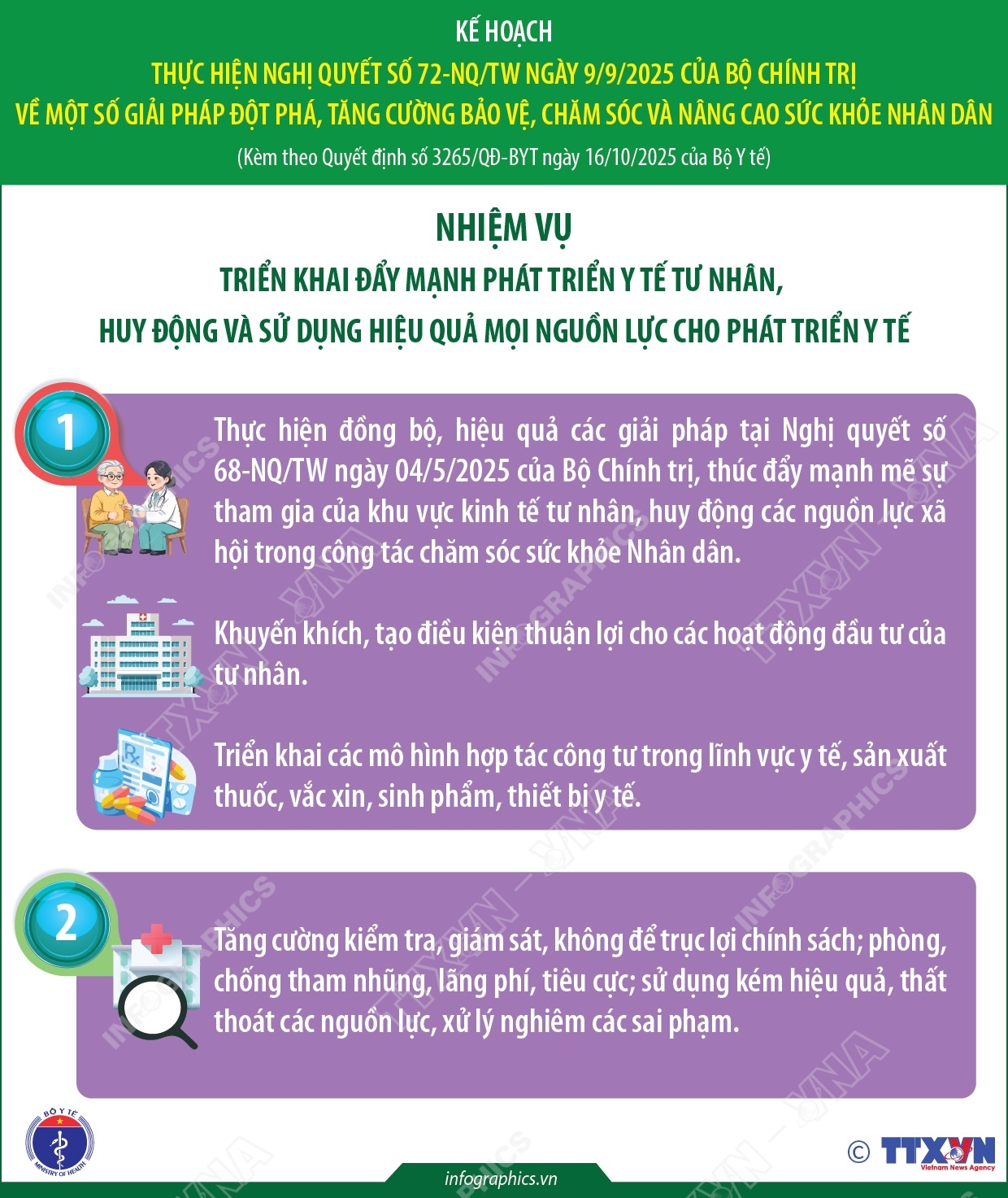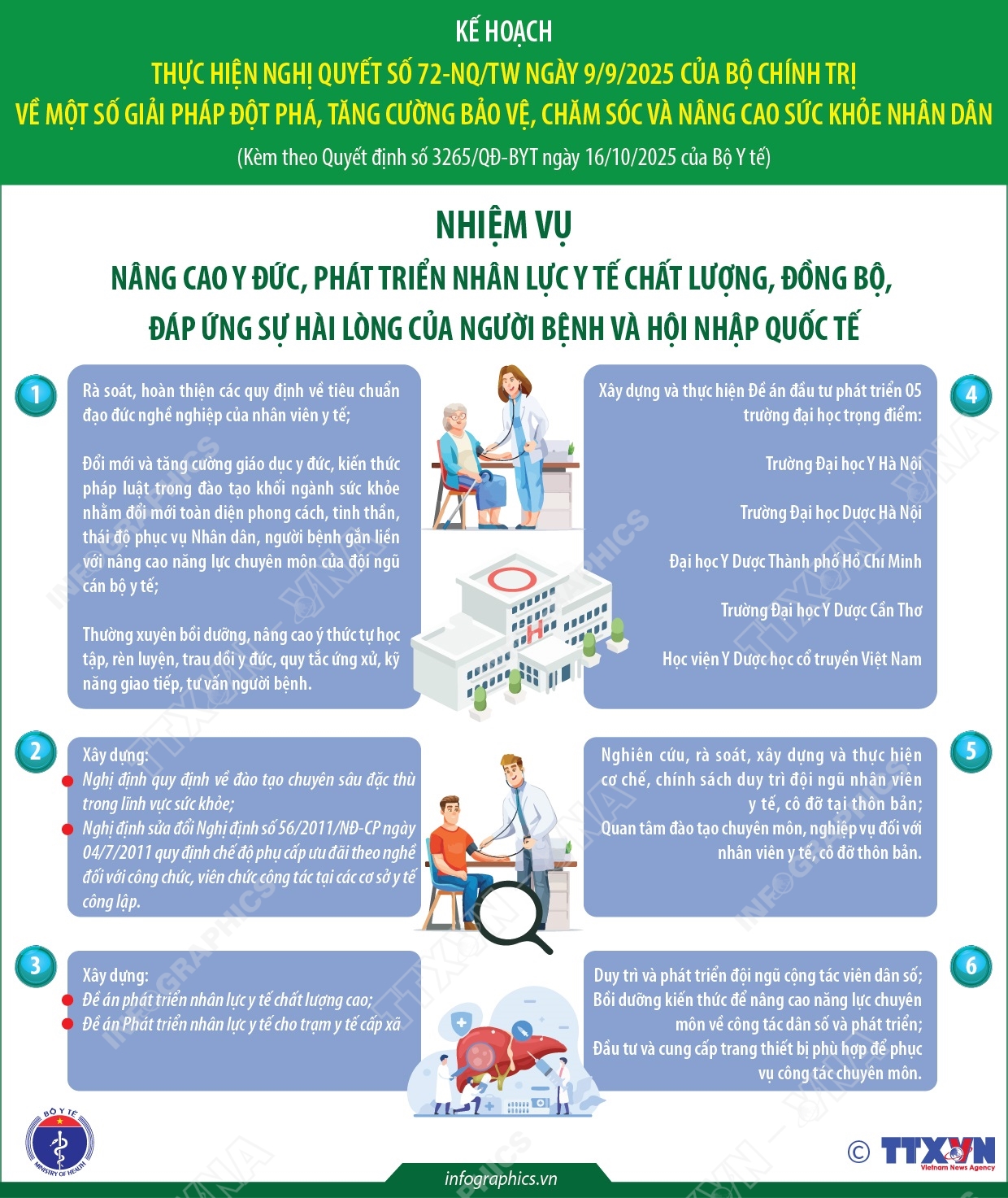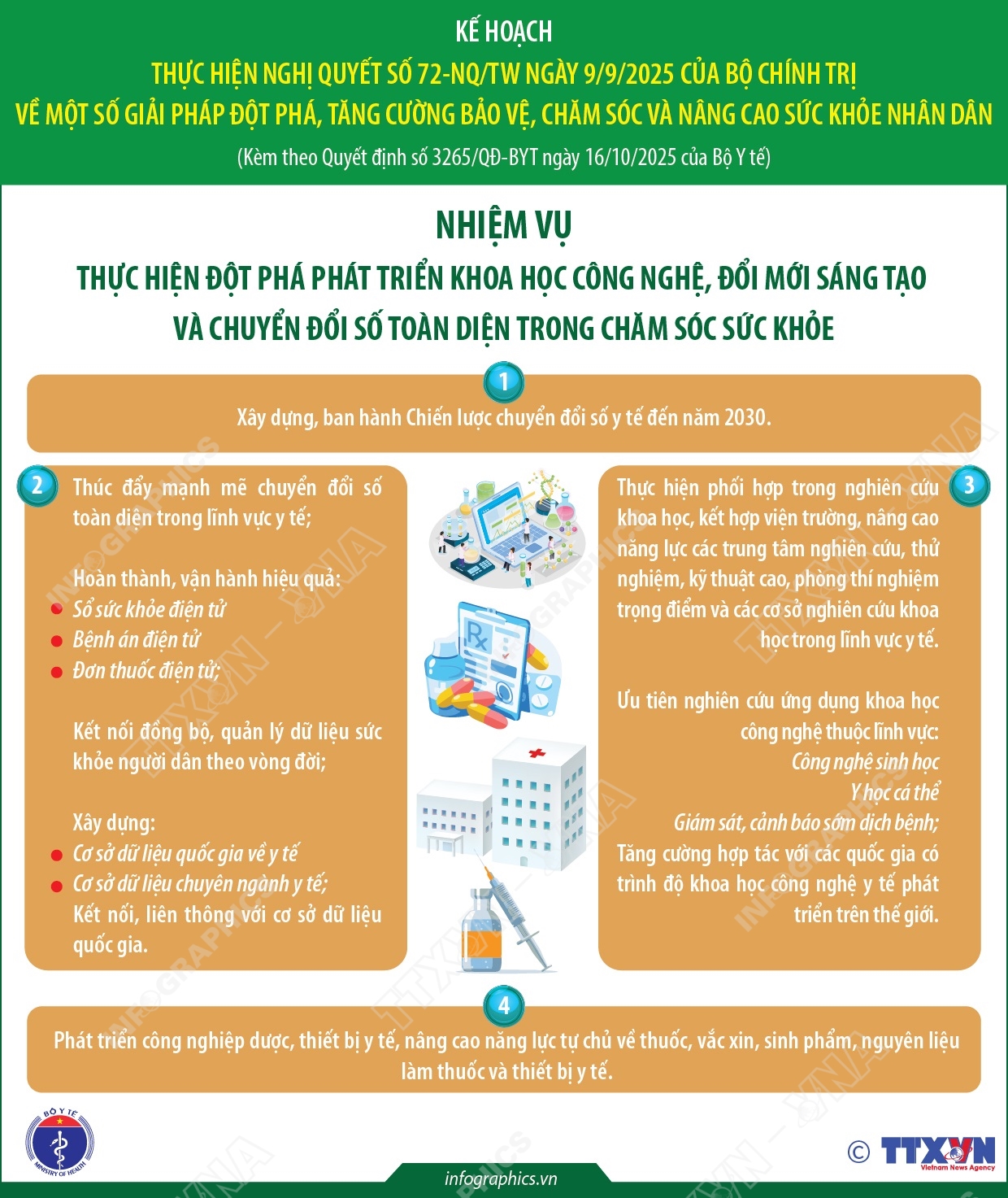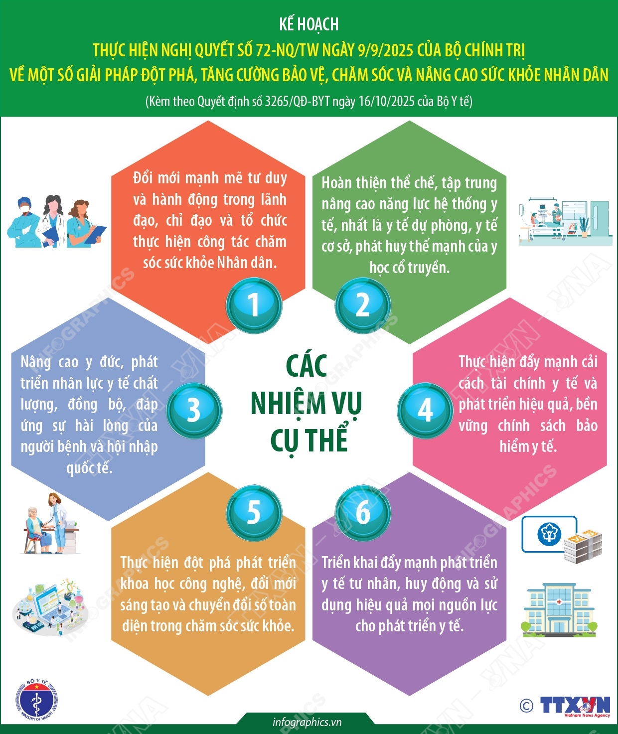 Hà Nội (TTXVN 9/11) Ngày 16/10/2025, Bộ Y tế đã ban hành kế hoạch thực hiện Nghị quyết số 72-NQ/TW ngày 09/9/2025 của Bộ Chính trị về một số giải pháp đột phá, tăng cường bảo vệ, chăm sóc và nâng cao sức khỏe Nhân dân. Kế hoạch đề ra 6 nhiệm vụ cụ thể để tăng cường bảo vệ, chăm sóc và nâng cao sức khỏe Nhân dân: Đổi mới mạnh mẽ tư duy và hành động trong lãnh đạo, chỉ đạo và tổ chức thực hiện công tác chăm sóc sức khỏe Nhân dân; Hoàn thiện thể chế, tập trung nâng cao năng lực hệ thống y tế, nhất là y tế dự phòng, y tế cơ sở, phát huy thế mạnh của y học cổ truyền; Nâng cao y đức, phát triển nhân lực y tế chất lượng, đồng bộ, đáp ứng sự hài lòng của người bệnh và hội nhập quốc tế; Thực hiện đẩy mạnh cải cách tài chính y tế và phát triển hiệu quả, bền vững chính sách bảo hiểm y tế; Thực hiện đột phá phát triển khoa học công nghệ, đổi mới sáng tạo và chuyển đổi số toàn diện trong chăm sóc sức khỏe và triển khai đẩy mạnh phát triển y tế tư nhân, huy động và sử dụng hiệu quả mọi nguồn lực cho phát triển y tế.