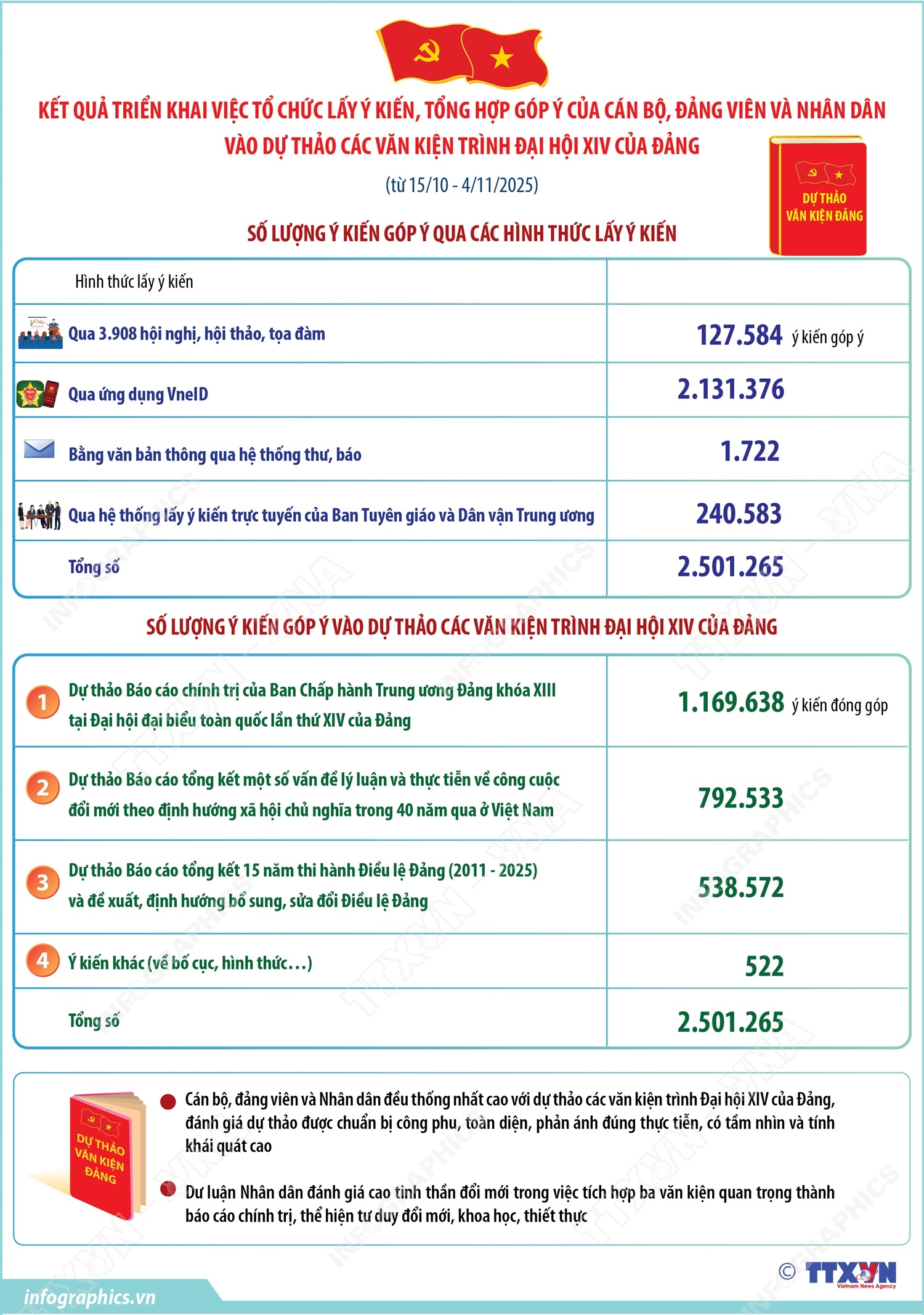Hà Nội (TTXVN 8/11) Trong thời gian từ 15/10/2025 đến ngày 06/11/2025, việc tổ chức lấy ý kiến góp ý của cán bộ, đảng viên và Nhân dân vào các dự thảo văn kiện trình Đại hội Đại biểu toàn quốc lần thứ XIV của Đảng được các tỉnh ủy, thành ủy, đảng ủy trực thuộc Trung ương triển khai nghiêm túc, khẩn trương, đồng bộ và đạt kết quả tích cực.