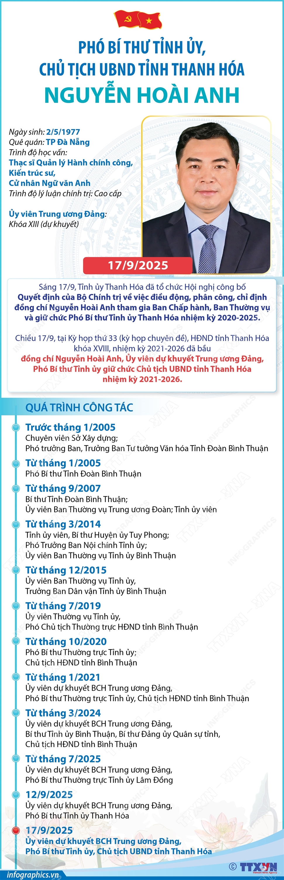 Hà Nội (TTXVN 17/9) Chiều ngày 17/9/2025, tại Kỳ họp thứ 33 (kỳ họp chuyên đề) HĐND tỉnh Thanh Hóa khóa XVIII, nhiệm kỳ 2021-2026 đã bầu đồng chí Nguyễn Hoài Anh, Ủy viên dự khuyết Trung ương Đảng, Phó Bí thư Tỉnh ủy Thanh Hóa giữ chức Chủ tịch UBND tỉnh Thanh Hóa nhiệm kỳ 2021-2026. Trước đó, sáng ngày 17/9/2025, Tỉnh ủy Thanh Hóa đã tổ chức Hội nghị công bố Quyết định của Bộ Chính trị về việc điều động, phân công, chỉ định đồng chí Nguyễn Hoài Anh tham gia Ban Chấp hành, Ban Thường vụ và giữ chức Phó Bí thư Tỉnh ủy Thanh Hóa nhiệm kỳ 2020-2025