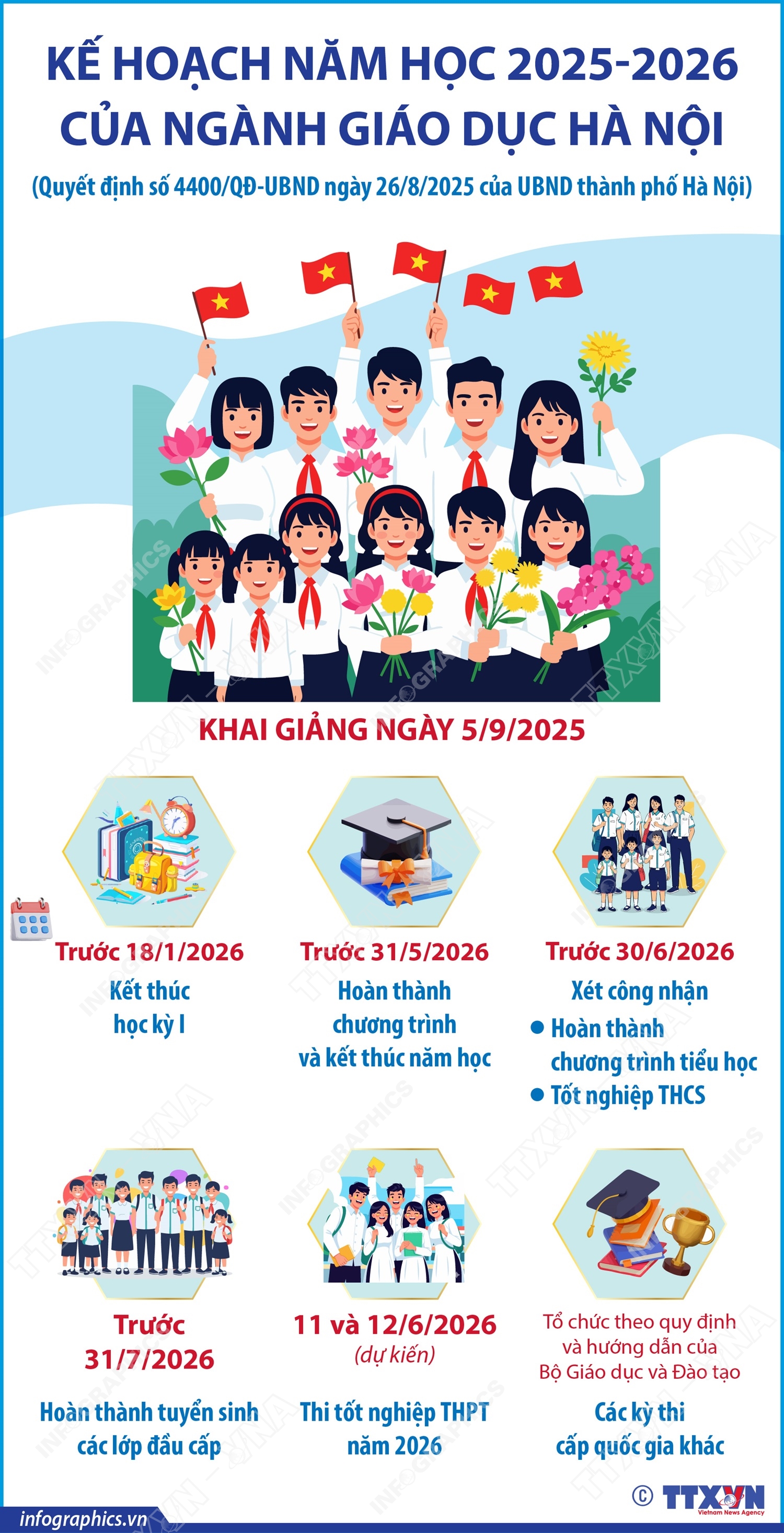 Hà Nội (TTXVN 4/9) Theo Khung kế hoạch thời gian năm học 2025-2026 đối với giáo dục mầm non, giáo dục phổ thông và giáo dục thường xuyên trên địa bàn thành phố Hà Nội, học sinh tựu trường sớm nhất trước 1 tuần so với ngày tổ chức khai giảng. Riêng đối với lớp 1, lớp 9, lớp 12 tựu trường sớm nhất trước 2 tuần so với ngày tổ chức khai giảng. Toàn thành phố tổ chức khai giảng vào ngày 5/9/2025 (thứ Sáu). Kỳ thi tốt nghiệp Trung học Phổ thông năm 2026 dự kiến diễn ra trong ngày 11 và 12/6/2026.