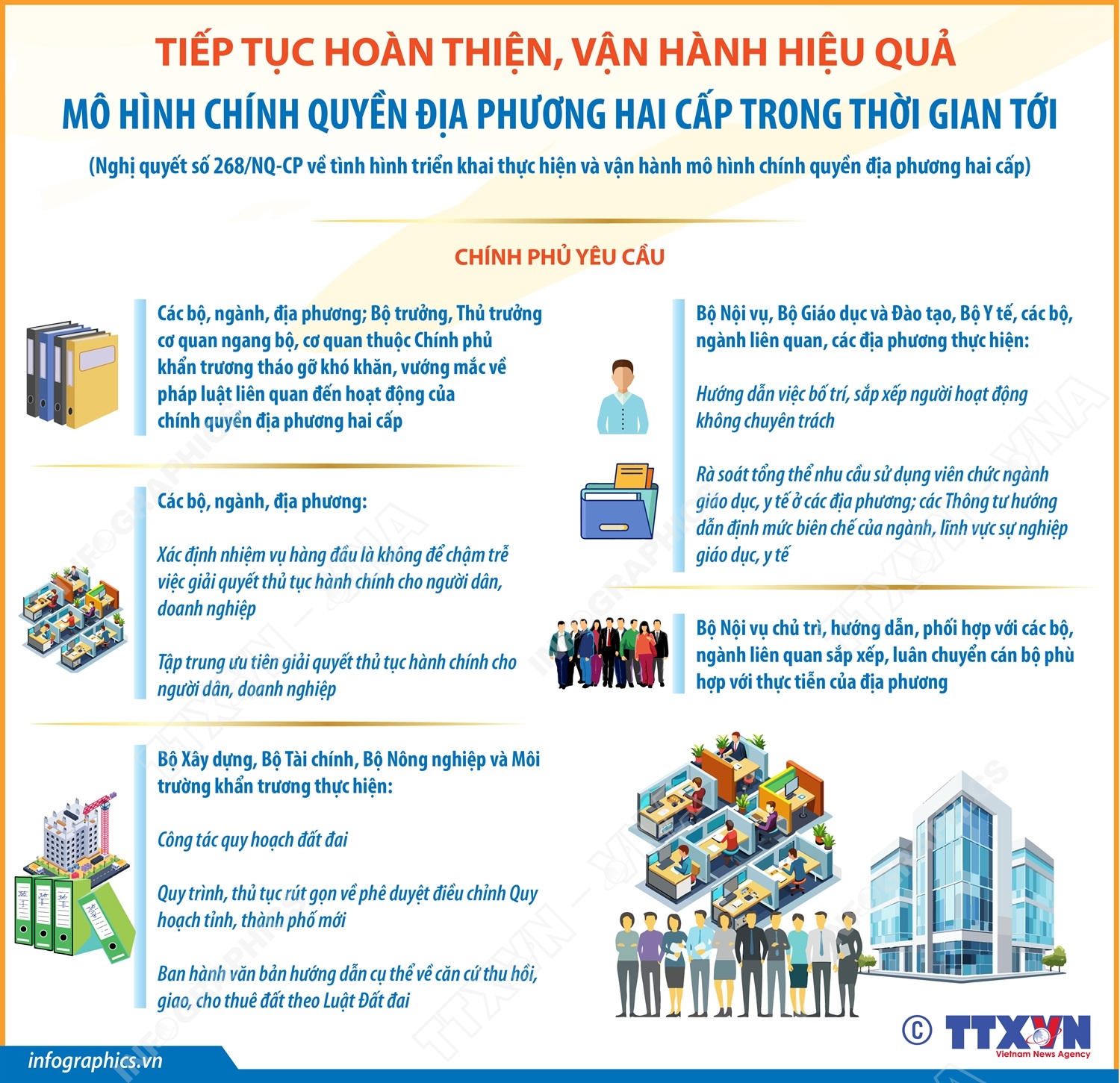 Hà Nội (TTXVN 4/9) Chính phủ vừa ban hành Nghị quyết 268/NQ-CP về tình hình triển khai thực hiện và vận hành mô hình chính quyền địa phương hai cấp. Nghị quyết nêu rõ, thời gian qua, việc sắp xếp và vận hành chính quyền địa phương hai cấp được đánh giá là cuộc cách mạng về tổ chức bộ máy, sắp xếp lại giang sơn để có hành trang mới, khí thế mới bước vào kỷ nguyên mới - kỷ nguyên vươn mình, giàu mạnh, văn minh, phồn vinh, thịnh vượng. Việc triển khai mô hình chính quyền địa phương hai cấp đã được Bộ Chính trị, Tổng Bí thư, Chính phủ, Thủ tướng Chính phủ lãnh đạo, chỉ đạo quyết liệt và các bộ, ngành, địa phương nghiêm túc thực hiện, đạt nhiều kết quả quan trọng, tạo bước chuyển rõ nét trong tổ chức và vận hành bộ máy hành chính nhà nước. Việc sắp xếp và vận hành chính quyền địa phương hai cấp đã nhận được sự đồng thuận chung của cả nước, sự ủng hộ của nhân dân, sự vào cuộc quyết liệt của cả hệ thống chính trị, đạt được kết quả tích cực, cơ bản đang đi vào ổn định, đúng hướng, trúng, đúng với nguyện vọng của nhân dân, giải quyết khó khăn, vướng mắc đã tồn tại nhiều năm qua.