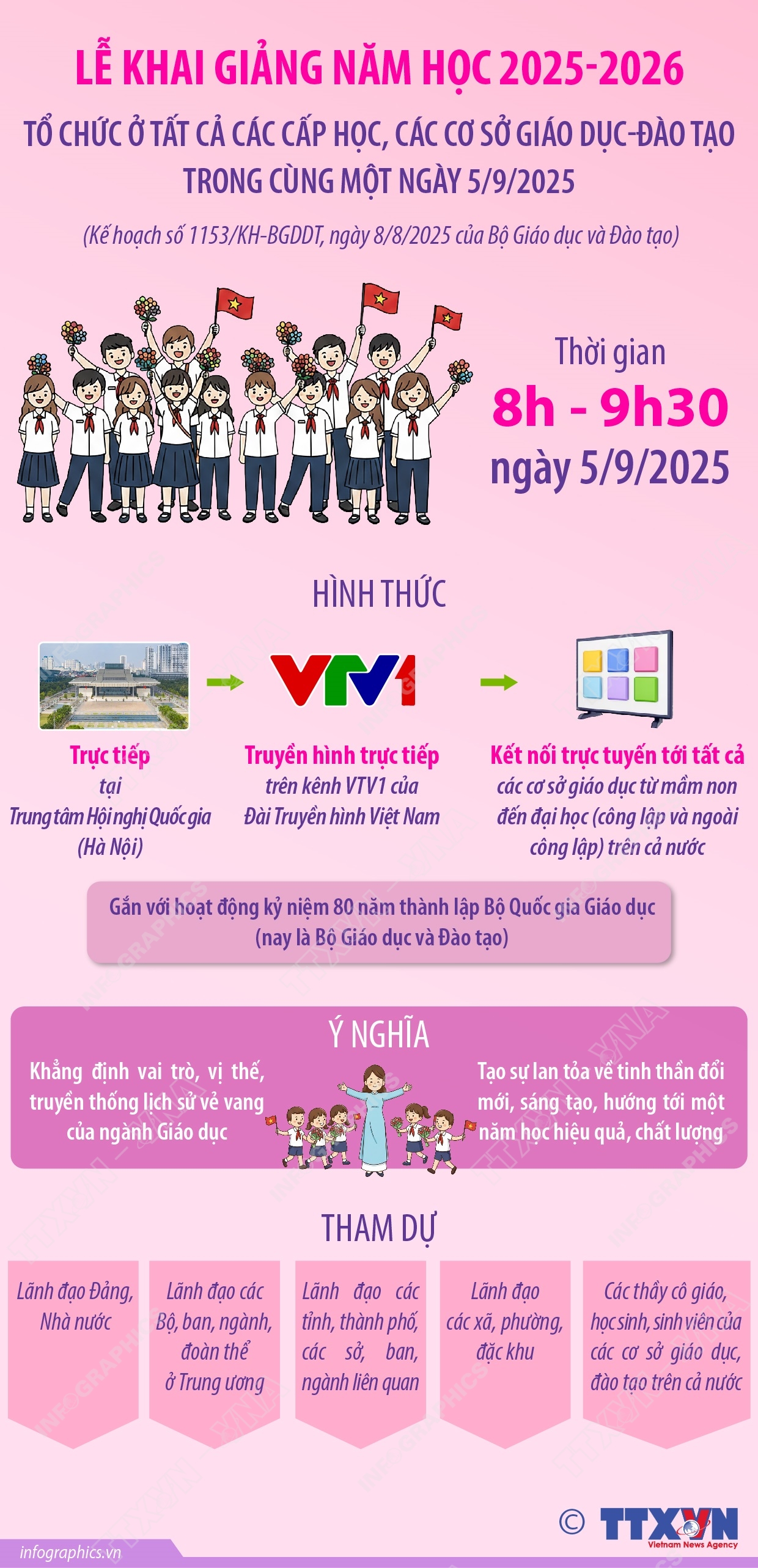 Hà Nội (TTXVN 5/9) Sáng 5/9/2025, Bộ Giáo dục và Đào tạo tổ chức Lễ khai giảng năm học mới 2025-2026 kết hợp kỷ niệm 80 năm thành lập Bộ Quốc gia Giáo dục (nay là Bộ Giáo dục và Đào tạo) tại Trung tâm Hội nghị Quốc gia (Hà Nội). Chương trình được truyền hình trực tiếp trên VTV1 và kết nối trực tuyến đến tất cả cơ sở giáo dục trong cả nước. Lễ khai giảng năm học 2025-2026 được tổ chức ở tất cả các cấp học, các cơ sở giáo dục-đào tạo cùng một ngày 5/9/2025 gắn với hoạt động kỷ niệm là sự kiện đặc biệt, nhằm lan tỏa truyền thống lịch sử vẻ vang của ngành Giáo dục nước nhà trong suốt 80 năm qua; tạo khí thế phấn khởi hướng tới một năm học hiệu quả, chất lượng.