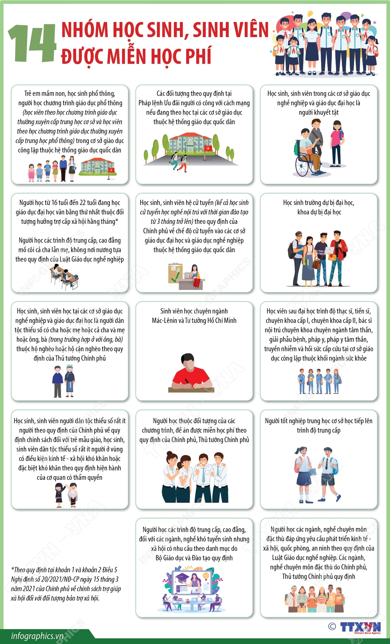 Hà Nội (TTXVN 5/9) Ngày 3/9/2025, Chính phủ ban hành Nghị định số 238/2025/NĐ-CP quy định về chính sách học phí, miễn, giảm, hỗ trợ học phí, hỗ trợ chi phí học tập và giá dịch vụ trong lĩnh vực giáo dục, đào tạo. Theo Nghị định, có 14 nhóm học sinh, sinh viên được miễn học phí.