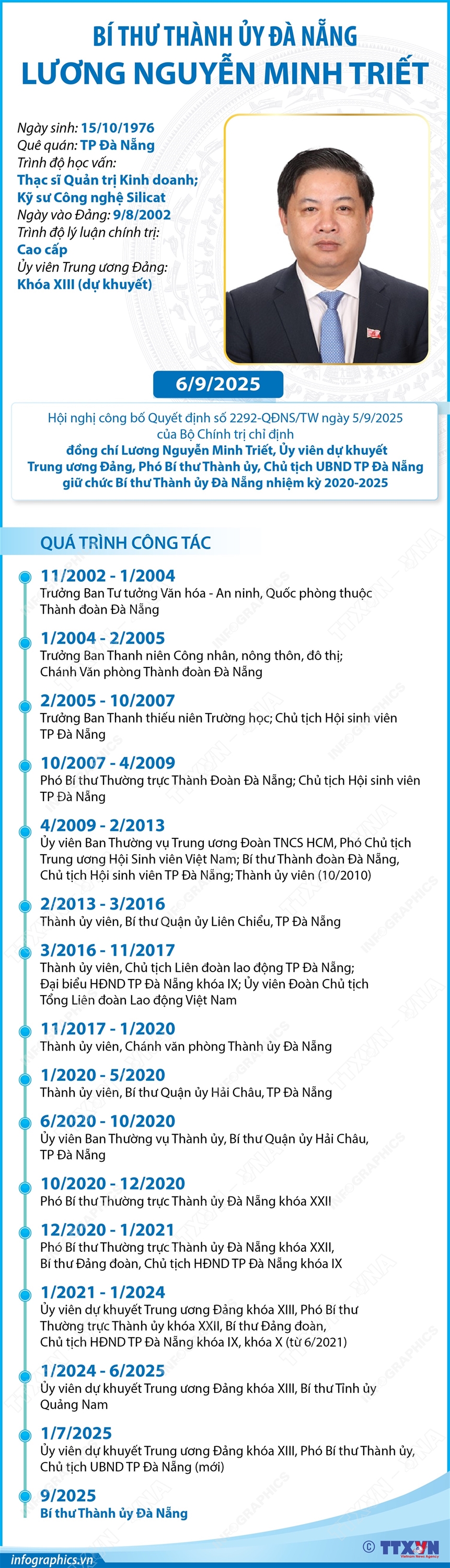 Hà Nội (TTXVN 6/9) Chiều 6/9/2025, Thành ủy Đà Nẵng tổ chức hội nghị công bố Quyết định số 2292-QĐNS/TW ngày 5/9/2025 của Bộ Chính trị chỉ định đồng chí Lương Nguyễn Minh Triết, Ủy viên dự khuyết Trung ương Đảng, Phó Bí thư Thành ủy, Chủ tịch UBND TP Đà Nẵng giữ chức Bí thư Thành ủy Đà Nẵng nhiệm kỳ 2020-2025.