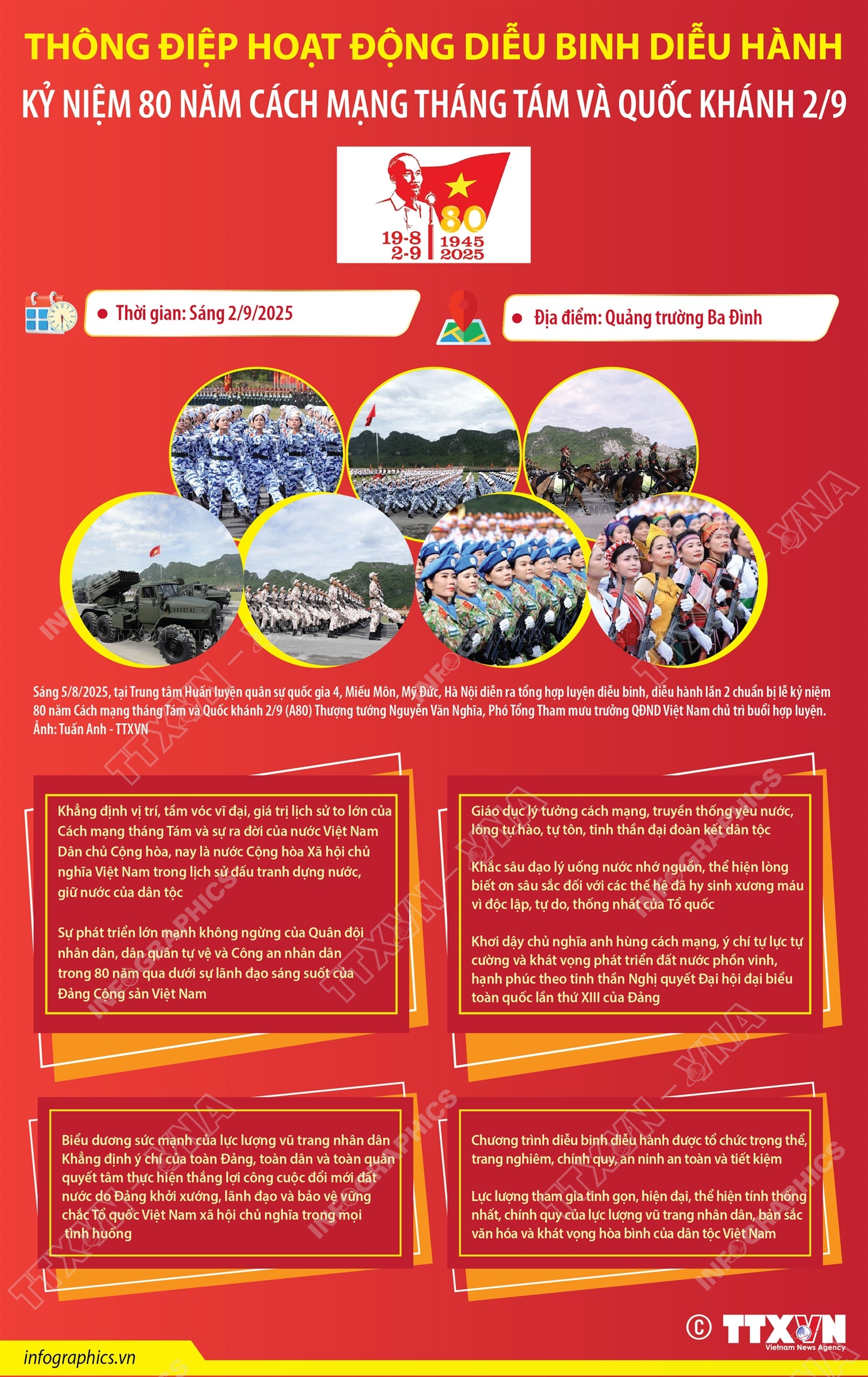 Hà Nội (TTXVN 17/8) Tại buổi họp báo Chính phủ thường kỳ tháng 7/2025 diễn ra chiều 7/8, Thiếu tướng Tống Văn Thanh, Phó Cục trưởng Cục Tuyên huấn, Tổng cục Chính trị Quân đội Nhân dân Việt Nam: Việc tổ chức diễu binh diễu hành trong lễ kỷ niệm đã được Trung ương giao cho Bộ Quốc phòng chủ trì, phối hợp với Bộ Công an, Bộ Văn hóa, Thể thao và Du lịch, thành phố Hà Nội và các ban, bộ, ngành, cơ quan, đơn vị liên quan và sẽ thực hiện tại Quảng trường Ba Đình vào sáng ngày mùng 2/9 tới đây. Hoạt động diễu binh diễu hành nhân dịp kỷ niệm 80 năm Cách mạng tháng Tám thành công và Quốc khánh mùng 2/9 muốn gửi gắm đến các tầng lớp nhân dân cũng như cộng đồng quốc tế bốn thông điệp.
