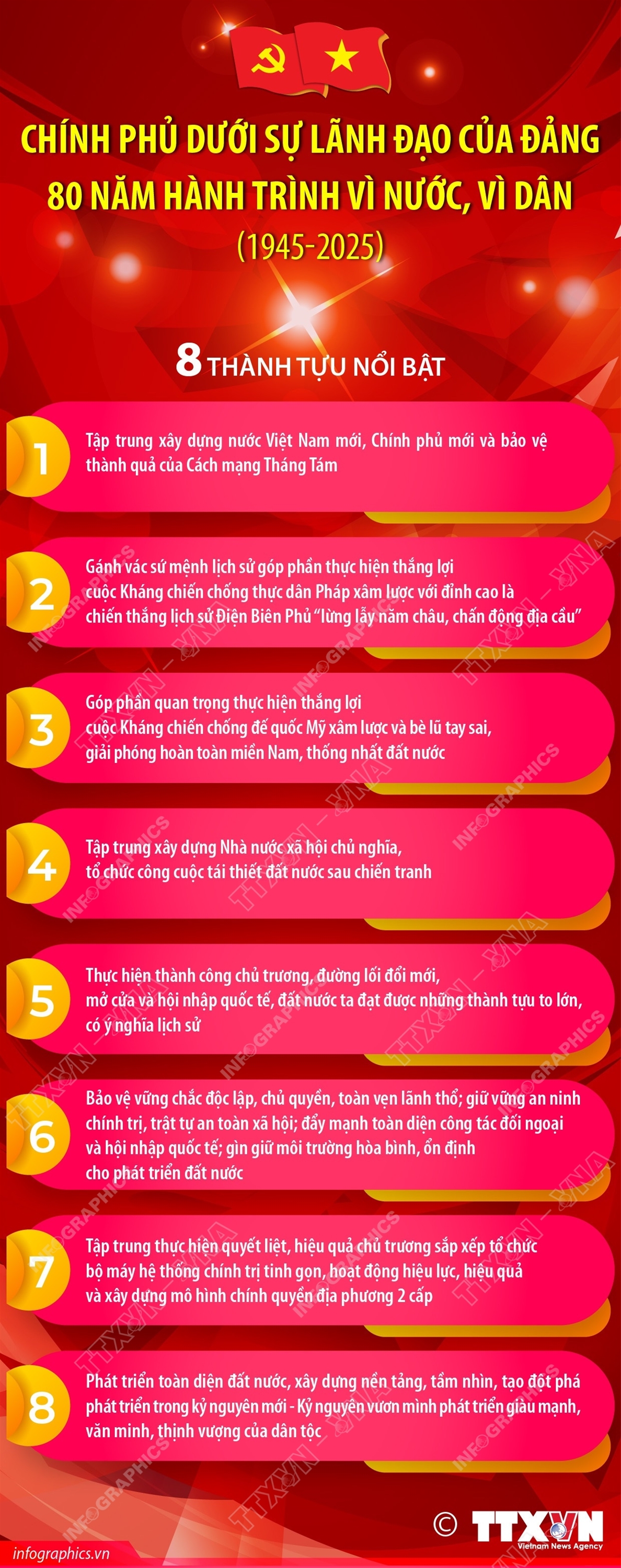 Hà Nội (TTXVN 20/8) Nhìn lại lịch sử 80 năm của Chính phủ qua các giai đoạn đầy cam go, thử thách nhưng cũng rất vẻ vang, vinh dự, tự hào của Cách mạng Việt Nam, dưới sự lãnh đạo của Trung ương Đảng, của Chủ tịch Hồ Chí Minh kính yêu, thường xuyên trực tiếp là Bộ Chính trị, Ban Bí thư, của đồng chí Tổng Bí thư qua các thời kỳ, từ Chính phủ lâm thời nước Việt Nam Dân chủ Cộng hòa năm 1945 đến Chính phủ nước CHXHCN Việt Nam ngày nay, chúng ta đều đoàn kết, thống nhất, “trên dưới đồng lòng, dọc ngang thông suốt”, luôn nỗ lực hết sức mình, phấn đấu không ngừng nghỉ, tất cả vì mục tiêu “Độc lập dân tộc gắn với chủ nghĩa xã hội” và cuộc sống ấm no, hạnh phúc của Nhân dân, góp phần đạt được những thắng lợi to lớn, tạo nên những bước ngoặt có tính “xoay chuyển tình thế, chuyển đổi trạng thái”, có thể khái quát 8 thành tựu nổi bật sau đây.