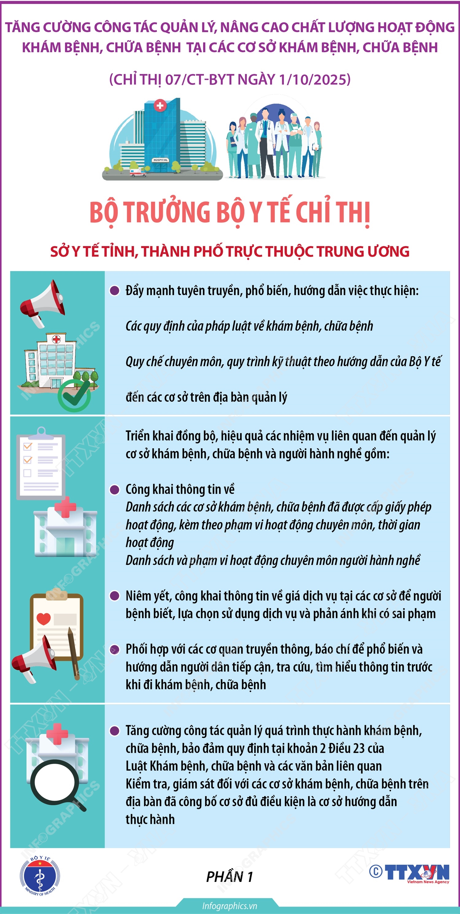 Hà Nội (TTXVN 10/10) Theo Chỉ thị 07/CT-BYT ngày 1/10/2025, Bộ trưởng Bộ Y tế chỉ thị Sở Y tế tỉnh, thành phố trực thuộc Trung ương: Đẩy mạnh tuyên truyền, phổ biến, hướng dẫn việc thực hiện các quy định của pháp luật về khám bệnh, chữa bệnh; quy chế chuyên môn, quy trình kỹ thuật theo hướng dẫn của Bộ Y tế đến các cơ sở trên địa bàn quản lý; triển khai đồng bộ, hiệu quả các nhiệm vụ liên quan đến quản lý cơ sở khám bệnh, chữa bệnh và người hành nghề; phối hợp với các cơ quan truyền thông, báo chí để phổ biến và hướng dẫn người dân tiếp cận, tra cứu, tìm hiểu thông tin trước khi đi khám bệnh, chữa bệnh...