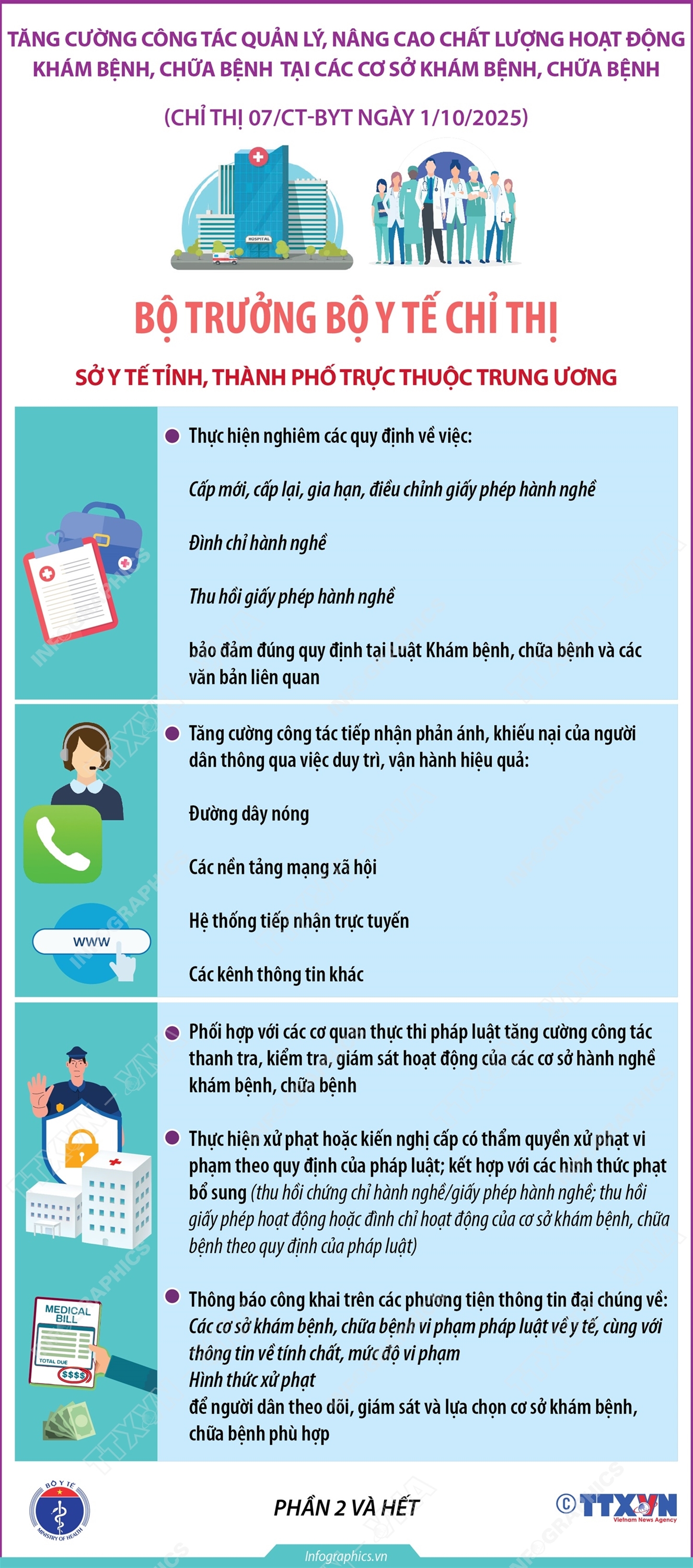 Hà Nội (TTXVN 10/10) Theo Chỉ thị 07/CT-BYT ngày 1/10/2025, Bộ trưởng Bộ Y tế chỉ thị Sở Y tế tỉnh, thành phố trực thuộc Trung ương: Thực hiện nghiêm các quy định về việc cấp mới, cấp lại, gia hạn, điều chỉnh giấy phép hành nghề; đình chỉ hành nghề; thu hồi giấy phép hành nghề bảo đảm đúng quy định tại Luật Khám bệnh, chữa bệnh và các văn bản liên quan. Tăng cường công tác tiếp nhận phản ánh, khiếu nại của người dân thông qua việc duy trì, vận hành hiệu quả đường dây nóng, các nền tảng mạng xã hội, hệ thống tiếp nhận trực tuyến và các kênh thông tin khác...