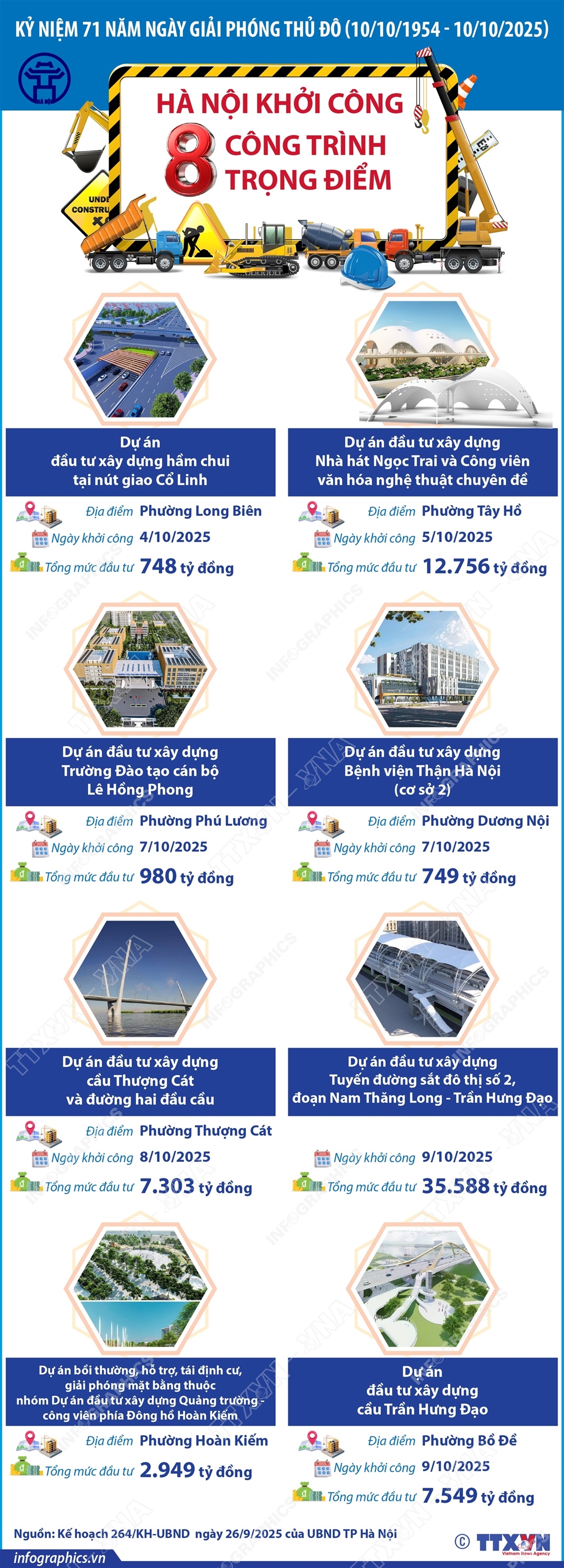 Hà Nội (TTXVN 10/10) Nhân kỷ niệm 71 năm Ngày Giải phóng Thủ đô (10/10/1954 - 10/10/2025), Hà Nội khởi công 8 công trình, dự án quan trọng trong các lĩnh vực hạ tầng giao thông, y tế, văn hóa và đô thị, góp phần tạo diện mạo mới cho thành phố. Trong đó, có nhiều dự án lớn như: Dự án Nhà hát Ngọc Trai và Công viên văn hóa nghệ thuật chuyên đề; Dự án tuyến đường sắt số 2, đoạn Nam Thăng Long - Trần Hưng Đạo; Dự án đầu tư xây dựng Quảng trường - công viên phía Đông hồ Hoàn Kiếm; Dự án đầu tư xây dựng cầu Trần Hưng Đạo; Dự án đầu tư xây dựng cầu Thượng Cát và đường hai đầu cầu…