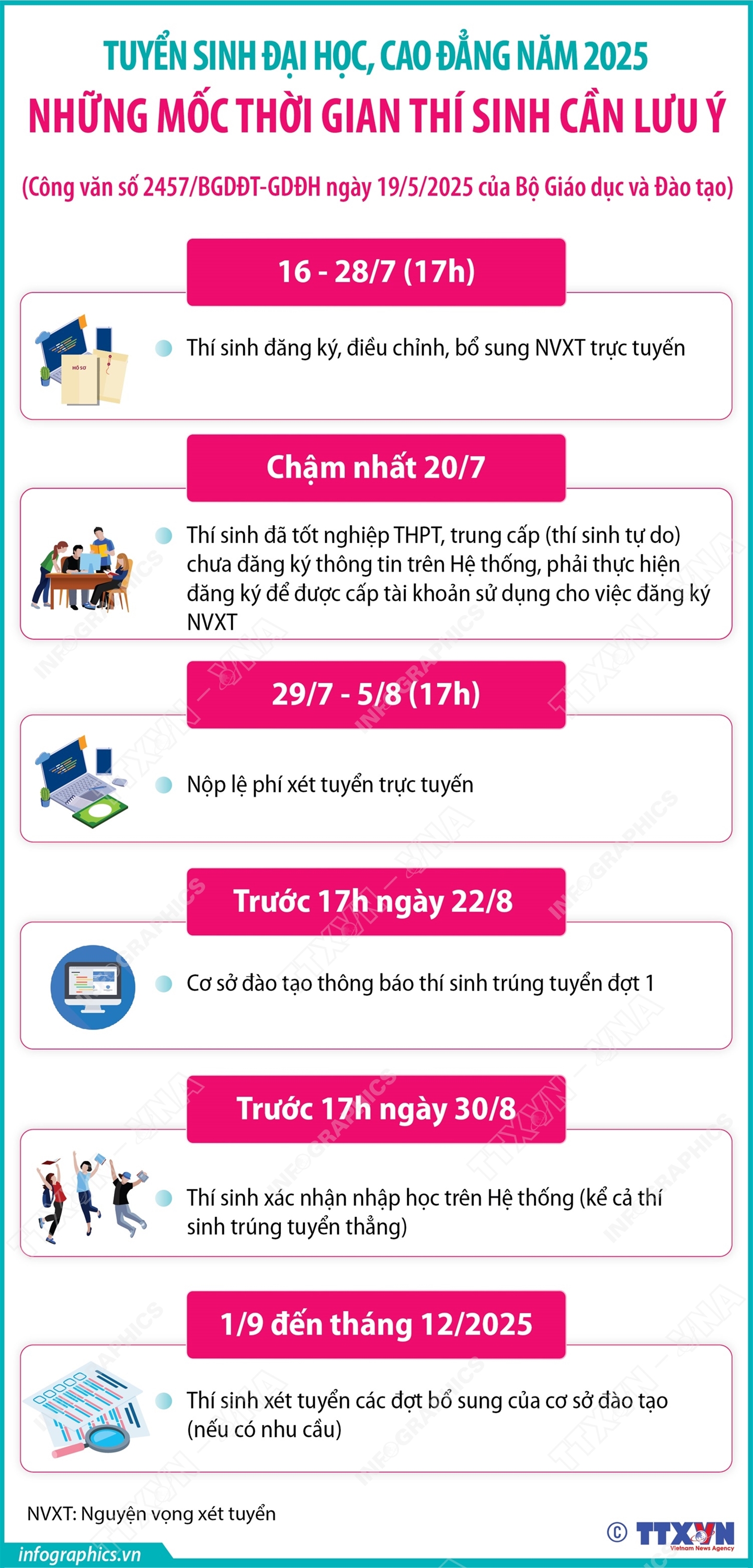 Hà Nội (TTXVN 15/7) Theo hướng dẫn của Bộ Giáo dục và Đào tạo về tuyển sinh đại học, tuyển sinh cao đẳng năm 2025, có những mốc thời gian thí sinh cần lưu ý khi tham gia Kỳ thi tuyển sinh đại học, tuyển sinh cao đẳng năm 2025. Cụ thể, từ ngày 10 - 20/7/2025, thí sinh đã tốt nghiệp THPT, trung cấp (thí sinh tự do) chưa đăng ký thông tin trên Hệ thống phải thực hiện đăng ký nguyện vọng xét tuyển. Từ ngày 29/7 đến 17h ngày 5/8/2025, thí sinh phải nộp lệ phí xét tuyển theo số lượng nguyện vọng xét tuyển bằng hình thức trực tuyến theo hướng dẫn của Bộ Bộ Giáo dục và Đào tạo. Trước 17h ngày 30/8/2025, thí sinh xác nhận nhập học trên Hệ thống…