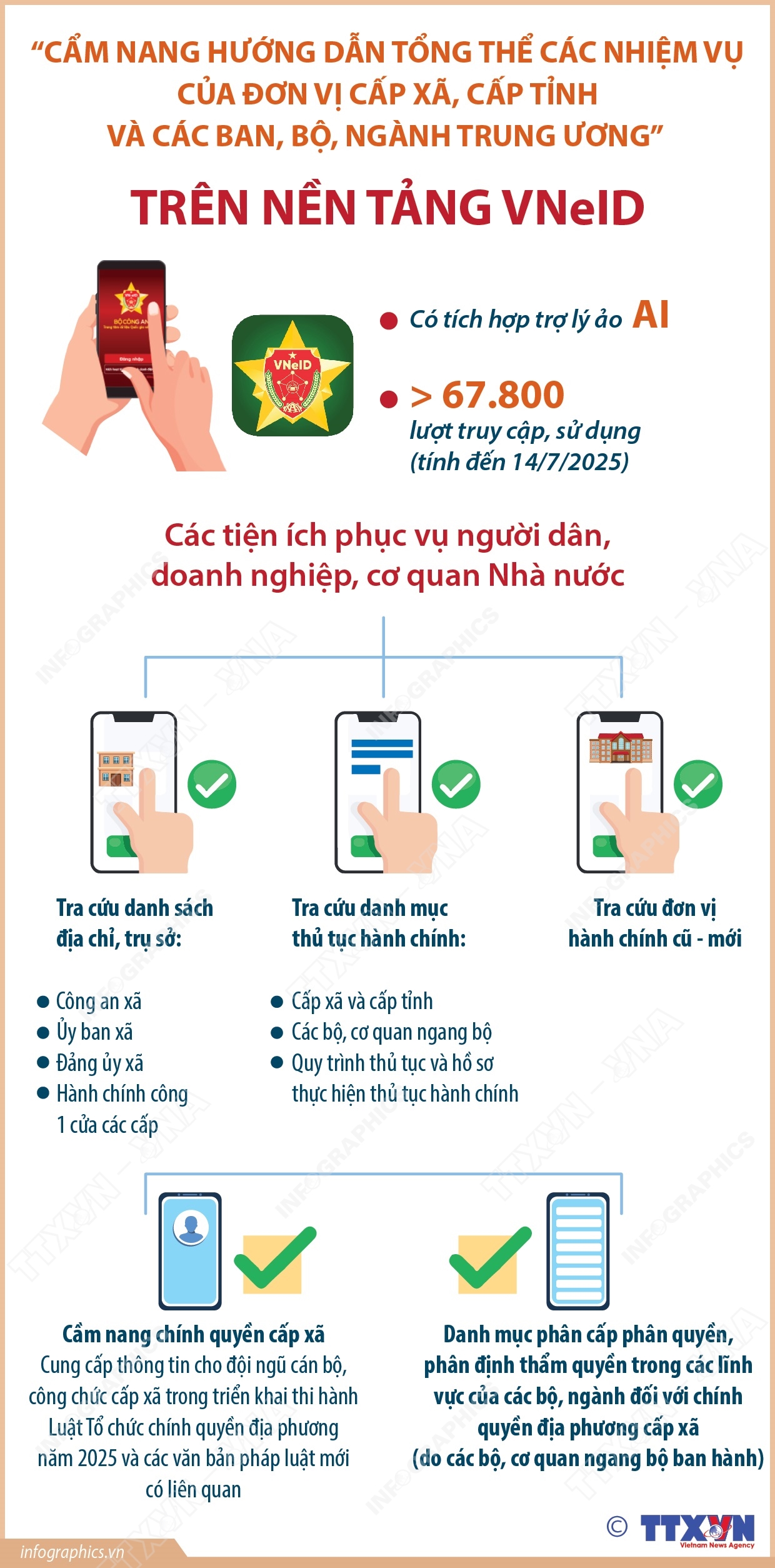 Hà Nội (TTXVN 15/7) Mặc dù mới được triển khai trong thời gian ngắn, “Cẩm nang hướng dẫn tổng thể các nhiệm vụ của đơn vị cấp xã, cấp tỉnh và các ban, bộ, ngành Trung ương” trên VNeID có tích hợp trợ lý ảo AI đã mang lại các giá trị, tiện ích cho người dân, doanh nghiệp, cơ quan Nhà nước. Mặc dù mới được triển khai trong thời gian ngắn, đến nay, cẩm nang đã có hơn 67.800 lượt truy cập, sử dụng, mang lại các giá trị, tiện ích cho người dân, doanh nghiệp, cơ quan Nhà nước.