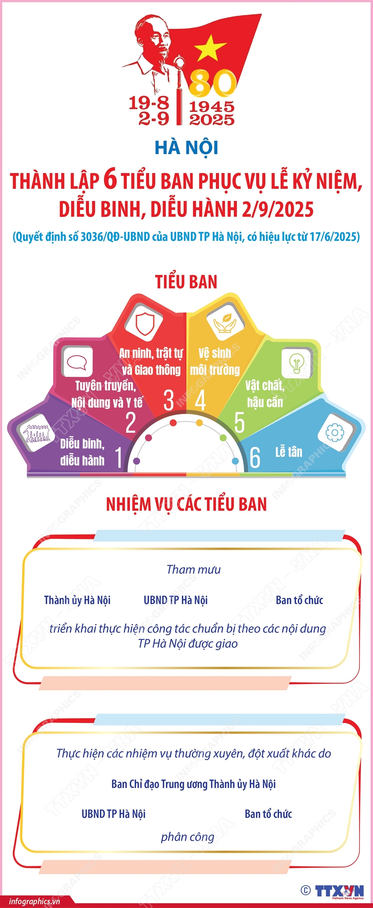 Hà Nội (TTXVN 17/7) Theo Quyết định số 3036/QĐ-UBND ngày 17/6/2025, UBND TP Hà Nội thành lập 6 tiểu ban giúp việc Ban tổ chức Lễ kỷ niệm, diễu binh, diễu hành kỷ niệm 80 năm Cách mạng Tháng Tám thành công (19/8/1945 - 19/8/2025) và Quốc khánh nước CHXHCN Việt Nam (2/9/1945 - 2/9/2025). Các tiểu ban gồm: Tiểu ban Diễu binh, diễu hành; Tiểu ban Tuyên truyền, Nội dung và Y tế; Tiểu ban An ninh, trật tự và Giao thông; Tiểu ban Vệ sinh môi trường; Tiểu ban Vật chất, hậu cần; Tiểu ban Lễ tân. Các tiểu ban có nhiệm vụ tham mưu Thành ủy, UBND thành phố, Ban tổ chức triển khai thực hiện công tác chuẩn bị Lễ kỷ niệm, diễu binh, diễu hành theo các nội dung TP Hà Nội được giao tại Đề án của Ban Chỉ đạo Trung ương và theo kế hoạch của UBND thành phố...