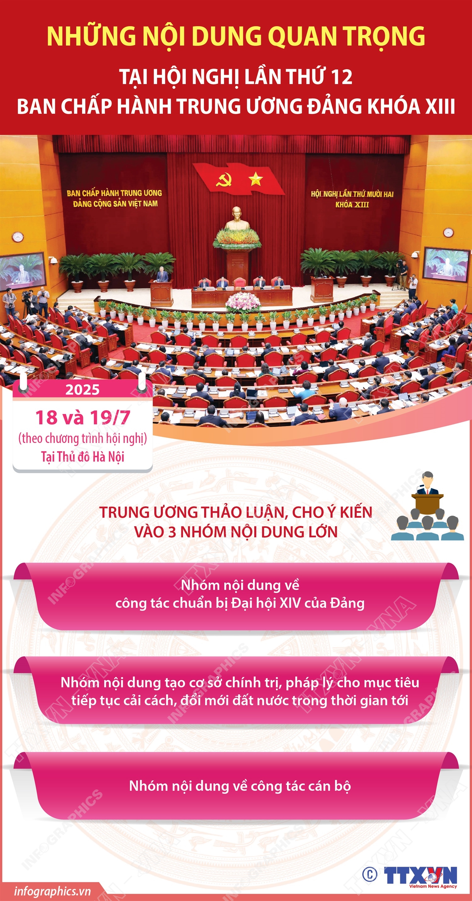 Hà Nội (TTXVN 18/7) Sáng 18/7/2025, Hội nghị lần thứ 12 Ban Chấp hành Trung ương Đảng khóa XIII đã khai mạc trọng thể tại Thủ đô Hà Nội. Tổng Bí thư Tô Lâm chủ trì, phát biểu khai mạc Hội nghị. Ủy viên Bộ Chính trị, Chủ tịch nước Lương Cường điều hành Phiên khai mạc. Tại Hội nghị lần này, Trung ương tập trung thảo luận, cho ý kiến vào ba nhóm nội dung lớn. Đó là Nhóm nội dung về công tác chuẩn bị Đại hội XIV của Đảng; Nhóm nội dung tạo cơ sở chính trị, pháp lý cho mục tiêu tiếp tục cải cách, đổi mới đất nước trong thời gian tới; Nhóm nội dung về công tác cán bộ. Theo chương trình, Hội nghị làm việc đến ngày 19/7/2025.