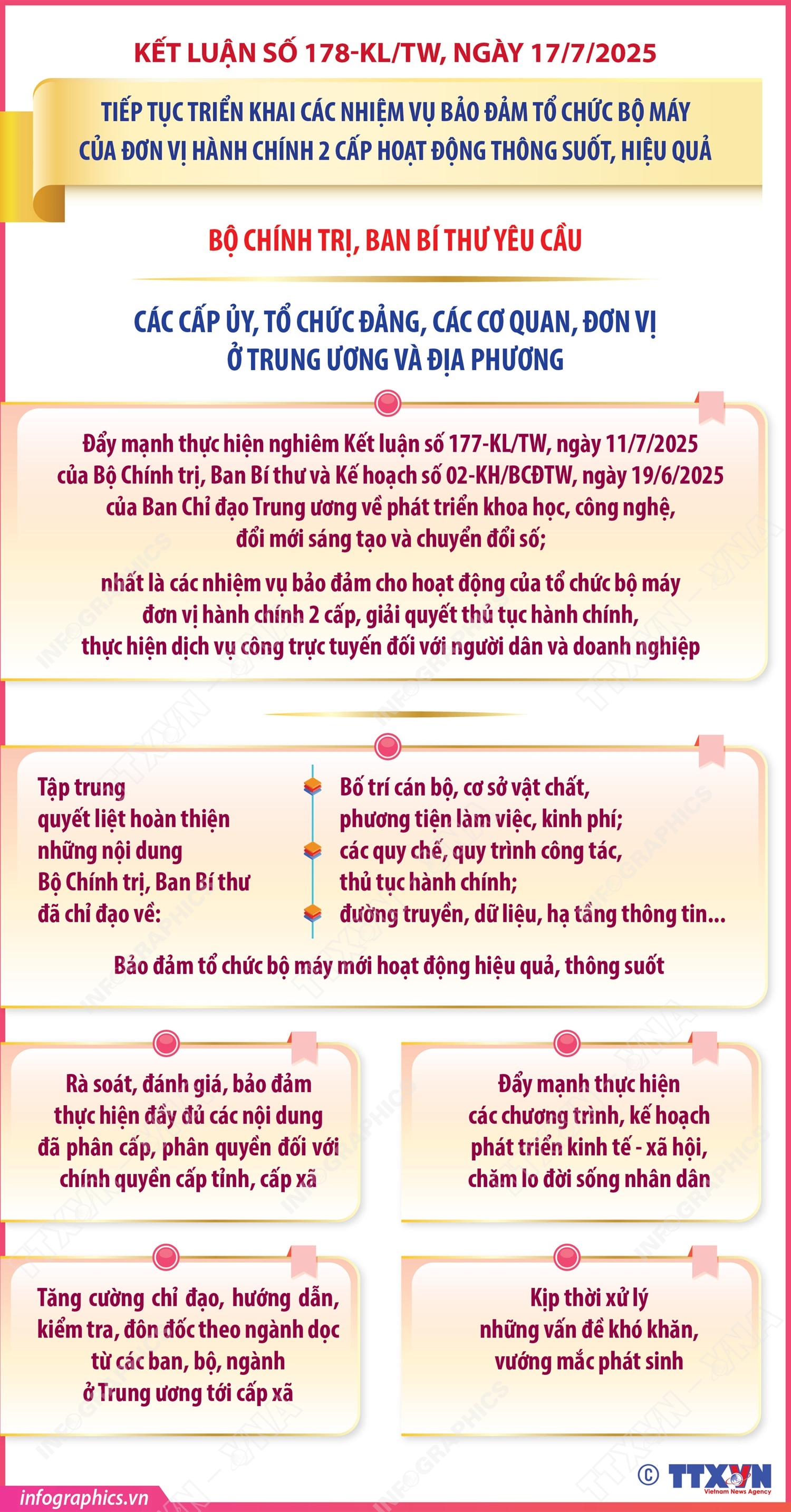 Hà Nội (TTXVN 18/7) Ngày 17/7/2025, Ủy viên Bộ Chính trị, Thường trực Ban Bí thư Trần Cẩm Tú đã ký ban hành Kết luận số 178-KL/TW của Bộ Chính trị, Ban Bí thư về tiếp tục triển khai các nhiệm vụ bảo đảm tổ chức bộ máy của đơn vị hành chính 2 cấp hoạt động thông suốt, hiệu quả (gọi tắt là Kết luận số 178). Bộ Chính trị, Ban Bí thư yêu cầu các cấp ủy, tổ chức đảng, các cơ quan, đơn vị ở Trung ương và địa phương 2 nhiệm vụ gồm: Đẩy mạnh thực hiện nghiêm Kết luận số 177-KL/TW, ngày 11/7/2025 của Bộ Chính trị, Ban Bí thư và Kế hoạch số 02-KH/BCĐTW, ngày 19/6/2025 của Ban Chỉ đạo Trung ương về phát triển khoa học, công nghệ, đổi mới sáng tạo và chuyển đổi số… Tập trung quyết liệt hoàn thiện những nội dung Bộ Chính trị, Ban Bí thư đã chỉ đạo về bố trí cán bộ, cơ sở vật chất, phương tiện làm việc, kinh phí; các quy chế, quy trình công tác, thủ tục hành chính; đường truyền, dữ liệu, hạ tầng thông tin...