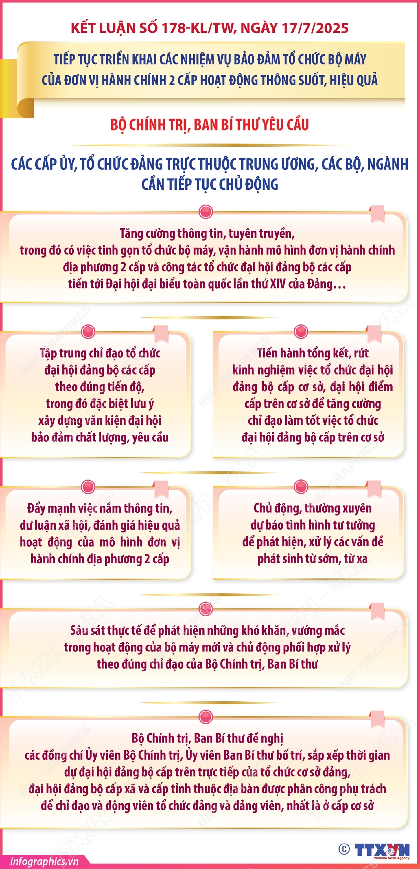 Hà Nội (TTXVN 18/7) Ngày 17/7/2025, Ủy viên Bộ Chính trị, Thường trực Ban Bí thư Trần Cẩm Tú đã ký ban hành Kết luận số 178-KL/TW của Bộ Chính trị, Ban Bí thư về tiếp tục triển khai các nhiệm vụ bảo đảm tổ chức bộ máy của đơn vị hành chính 2 cấp hoạt động thông suốt, hiệu quả (gọi tắt là Kết luận số 178). Bộ Chính trị, Ban Bí thư yêu cầu các cấp ủy, tổ chức đảng trực thuộc Trung ương, các bộ, ngành cần tiếp tục chủ động thực hiện những nhiệm vụ sau: Tăng cường thông tin, tuyên truyền, trong đó có việc tinh gọn tổ chức bộ máy, vận hành mô hình đơn vị hành chính địa phương 2 cấp và công tác tổ chức đại hội đảng bộ các cấp tiến tới Đại hội đại biểu toàn quốc lần thứ XIV của Đảng… Tập trung chỉ đạo tổ chức đại hội đảng bộ các cấp theo đúng tiến độ, trong đó đặc biệt lưu ý xây dựng văn kiện đại hội bảo đảm chất lượng, yêu cầu. Tiến hành tổng kết, rút kinh nghiệm việc tổ chức đại hội đảng bộ cấp cơ sở, đại hội điểm cấp trên cơ sở để tăng cường chỉ đạo làm tốt việc tổ chức đại hội đảng bộ cấp trên cơ sở….