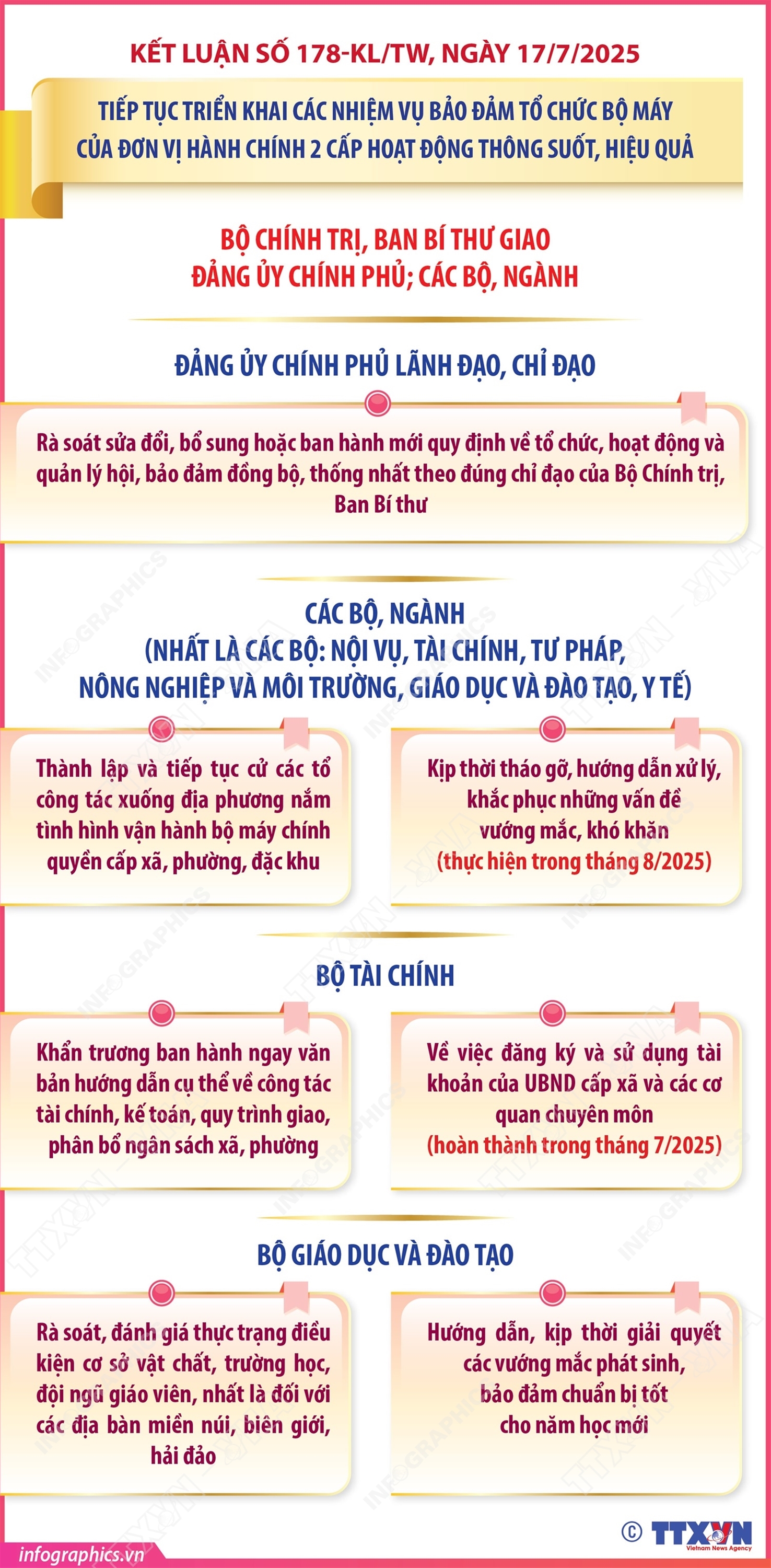 Hà Nội (TTXVN 18/7) Ngày 17/7/2025, Ủy viên Bộ Chính trị, Thường trực Ban Bí thư Trần Cẩm Tú đã ký ban hành Kết luận số 178-KL/TW của Bộ Chính trị, Ban Bí thư về tiếp tục triển khai các nhiệm vụ bảo đảm tổ chức bộ máy của đơn vị hành chính 2 cấp hoạt động thông suốt, hiệu quả (gọi tắt là Kết luận số 178). Bộ Chính trị, Ban Bí thư giao Đảng ủy Chính phủ lãnh đạo, chỉ đạo rà soát sửa đổi, bổ sung hoặc ban hành mới quy định về tổ chức, hoạt động và quản lý hội, bảo đảm đồng bộ, thống nhất theo đúng chỉ đạo của Bộ Chính trị, Ban Bí thư. Các bộ, ngành (nhất là các Bộ: Nội vụ, Tài chính, Tư pháp, Nông nghiệp và Môi trường, Giáo dục và Đào tạo, Y tế) thành lập và tiếp tục cử các tổ công tác xuống địa phương nắm tình hình vận hành bộ máy chính quyền cấp xã, phường, đặc khu; kịp thời tháo gỡ, hướng dẫn xử lý, khắc phục những vấn đề vướng mắc, khó khăn (thực hiện trong tháng 8/2025)...
