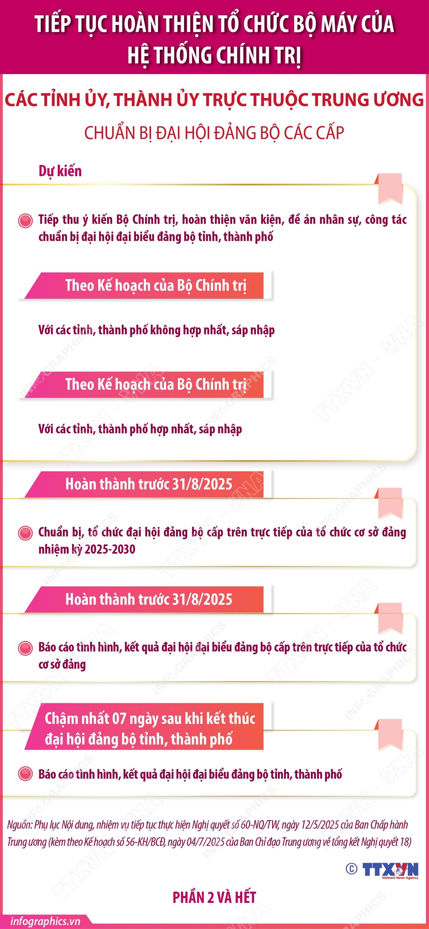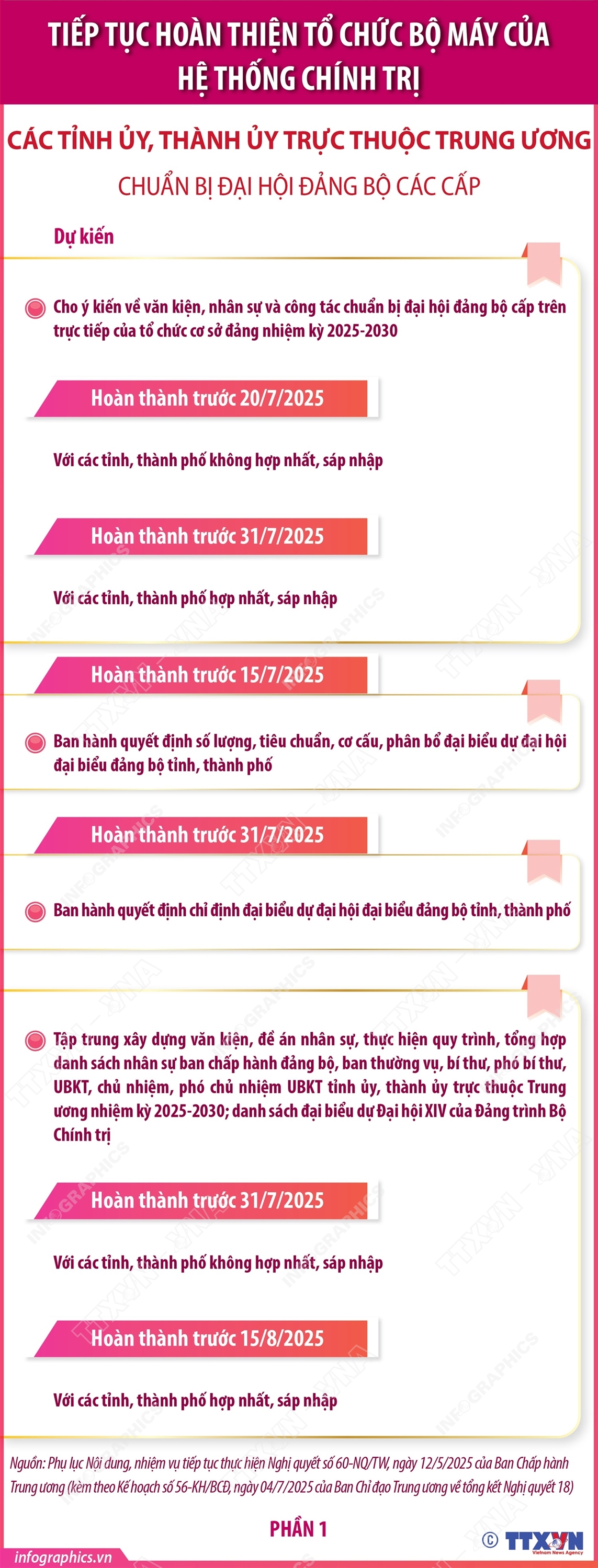 Hà Nội (TTXVN 12/7) Thực hiện Nghị quyết số 60-NQ/TW, ngày 12/4/2025 của Ban Chấp hành Trung ương Đảng khóa XIII về tiếp tục sắp xếp tổ chức bộ máy của hệ thống chính trị và các kết luận của Bộ Chính trị, Ban Bí thư; Ban Chỉ đạo Trung ương về tổng kết Nghị quyết 18 ban hành Kế hoạch 56-KH/BCĐ ngày 4/7/2025 tiếp tục hoàn thiện tổ chức bộ máy của hệ thống chính trị và chuẩn bị Đại hội đảng bộ các cấp. Dưới đây là các nhiệm vụ cụ thể của các tỉnh ủy, thành ủy Trung ương để chuẩn bị cho đại hội đảng bộ các cấp.
