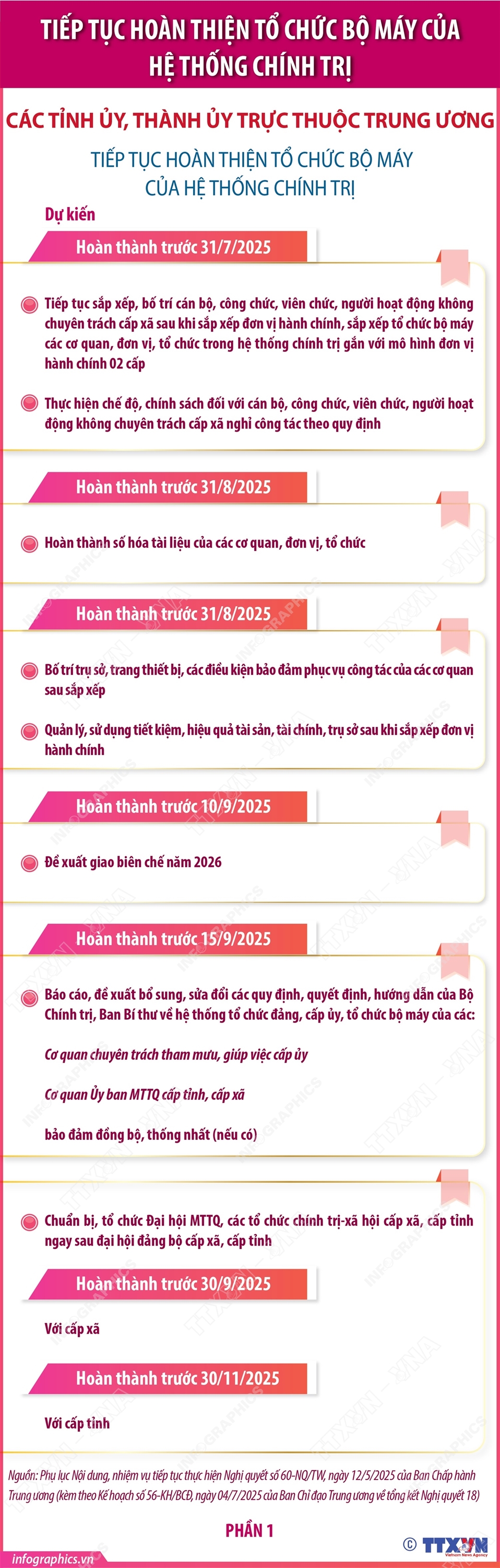 Hà Nội (TTXVN 12/7) Thực hiện Nghị quyết số 60-NQ/TW, ngày 12/4/2025 của Ban Chấp hành Trung ương Đảng khóa XIII về tiếp tục sắp xếp tổ chức bộ máy của hệ thống chính trị và các kết luận của Bộ Chính trị, Ban Bí thư; Ban Chỉ đạo Trung ương về tổng kết Nghị quyết 18 ban hành Kế hoạch 56-KH/BCĐ ngày 4/7/2025 tiếp tục hoàn thiện tổ chức bộ máy của hệ thống chính trị và chuẩn bị Đại hội đảng bộ các cấp. Dưới đây là các nhiệm vụ cụ thể của các tỉnh ủy, thành ủy Trung ương để tiếp tục hoàn thiện tổ chức bộ máy của hệ thống chính trị.