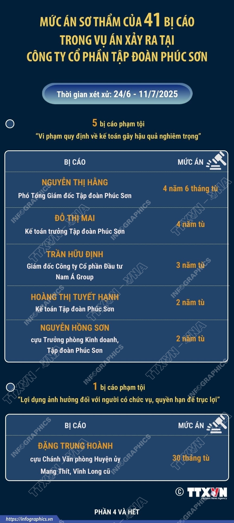 Hà Nội (TTXVN 11/7) Sau 17 ngày xét xử và nghị án, sáng 11/7/2024, Tòa án nhân dân thành phố Hà Nội đã tuyên án đối với 41 bị cáo trong vụ án xảy ra tại Công ty cổ phần Tập đoàn Phúc Sơn (Tập đoàn Phúc Sơn).Tòa đã tuyên án phạt bị cáo Nguyễn Văn Hậu (Chủ tịch Hội đồng quản trị, Tổng Giám đốc Tập đoàn Phúc Sơn) 14 năm tù về tội “Đưa hối lộ”; 9 năm tù về tội “Vi phạm quy định về đấu thầu gây hậu quả nghiêm trọng”; 7 năm tù về tội “Vi phạm quy định về kế toán gây hậu quả nghiêm trọng”. Tổng hợp hình phạt chung của 3 tội đối với bị cáo Hậu là 30 năm tù. Có 9 bị cáo bị phạt tù về tội “Nhận hối lộ”; 8 bị cáo phạm tội “Lợi dụng chức vụ, quyền hạn trong khi thi hành công vụ”; 17 bị cáo phạm tội “Vi phạm quy định về đấu thầu gây hậu quả nghiêm trọng”; 5 bị cáo phạm tội “Vi phạm quy định về kế toán gây hậu quả nghiêm trọng”. Riêng bị cáo Đặng Trung Hoành (cựu Chánh Văn phòng Huyện ủy Mang Thít, Vĩnh Long cũ) bị tuyên phạt 30 tháng tù về tội “Lợi dụng ảnh hưởng đối với người có chức vụ, quyền hạn để trục lợi”.