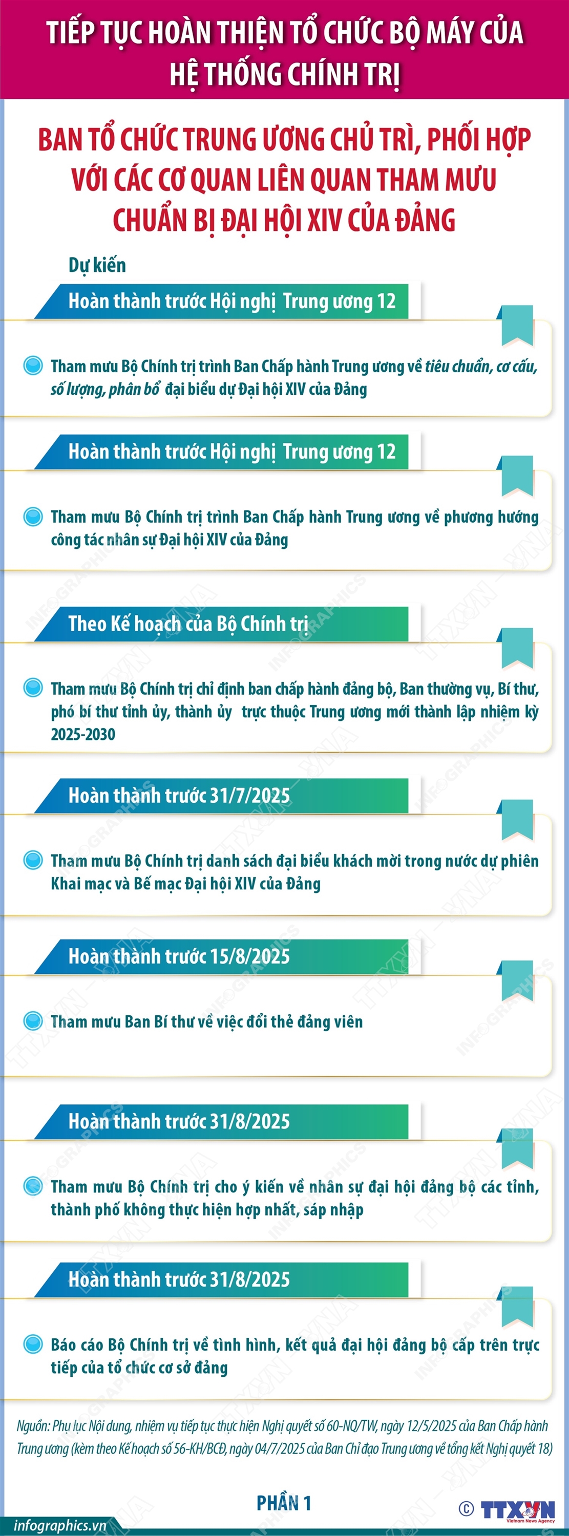Hà Nội (TTXVN 11/7) Thực hiện Nghị quyết số 60-NQ/TW, ngày 12/4/2025 của Ban Chấp hành Trung ương Đảng khóa XIII về tiếp tục sắp xếp tổ chức bộ máy của hệ thống chính trị và các kết luận của Bộ Chính trị, Ban Bí thư; Ban Chỉ đạo Trung ương về tổng kết Nghị quyết 18 ban hành Kế hoạch 56-KH/BCĐ ngày 4/7/2025 tiếp tục hoàn thiện tổ chức bộ máy của hệ thống chính trị và chuẩn bị Đại hội đảng bộ các cấp. Dưới đây là các nhiệm vụ cụ thể của Ban Tổ chức Trung ương trong việc chủ trì phối hợp với các cơ quan liên quan tham mưu chuẩn bị Đại hội XIV của Đảng.