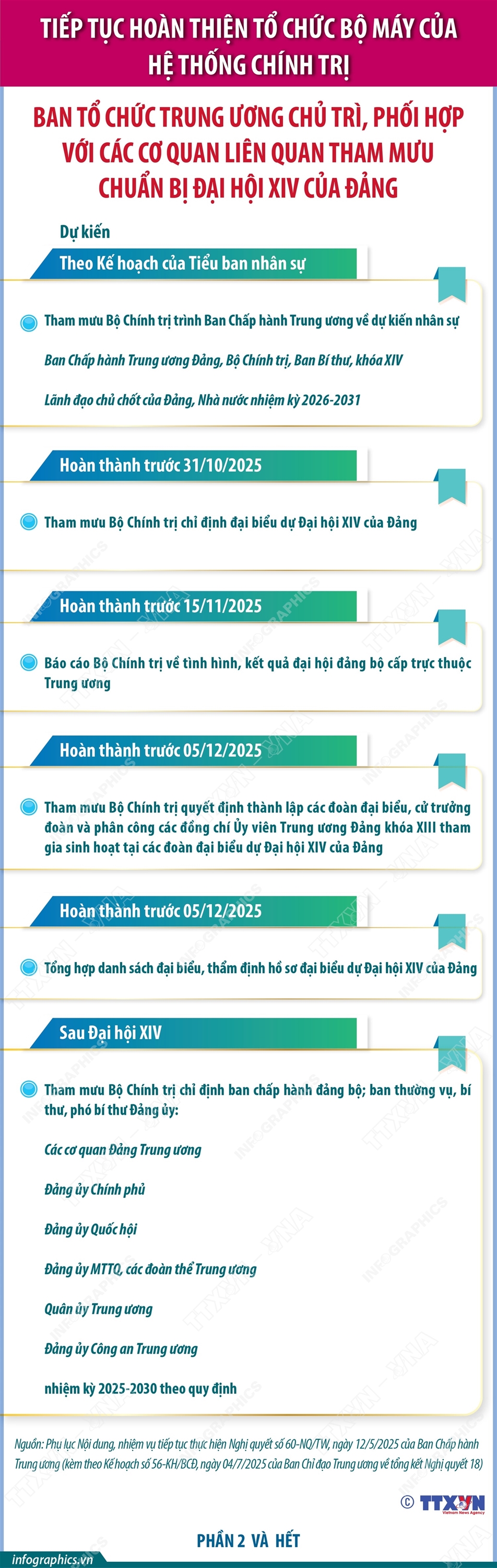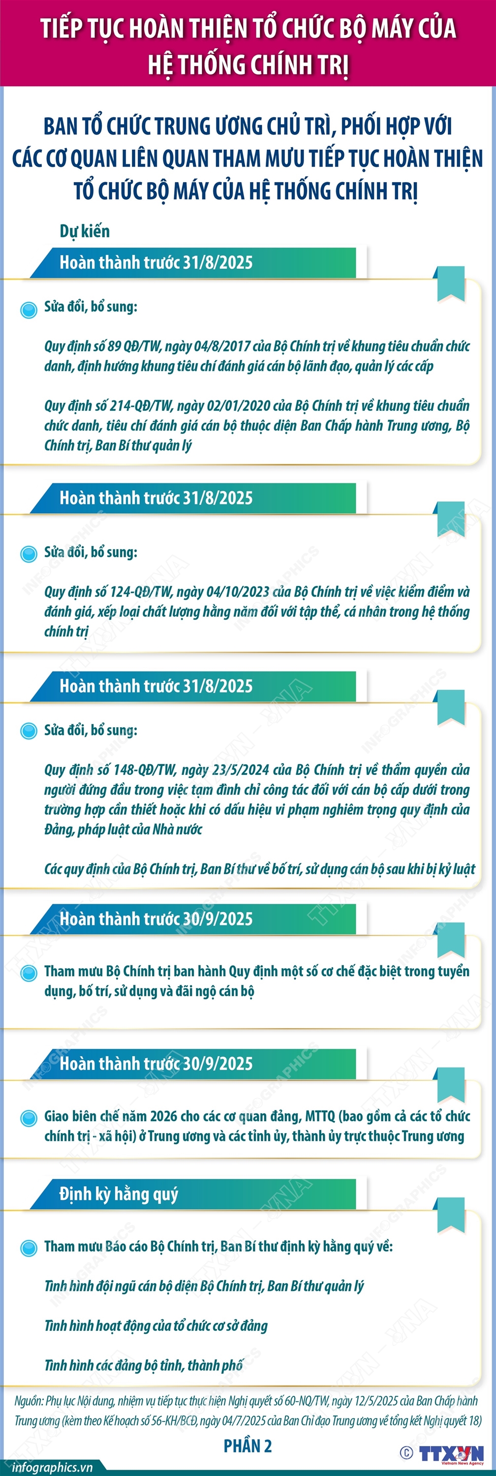 Hà Nội (TTXVN 11/7) Thực hiện Nghị quyết số 60-NQ/TW, ngày 12/4/2025 của Ban Chấp hành Trung ương Đảng khóa XIII về tiếp tục sắp xếp tổ chức bộ máy của hệ thống chính trị và các kết luận của Bộ Chính trị, Ban Bí thư; Ban Chỉ đạo Trung ương về tổng kết Nghị quyết 18 ban hành Kế hoạch 56-KH/BCĐ ngày 4/7/2025 tiếp tục hoàn thiện tổ chức bộ máy của hệ thống chính trị và chuẩn bị Đại hội đảng bộ các cấp. Dưới đây là các nhiệm vụ cụ thể của Ban Tổ chức Trung ương trong việc chủ trì phối hợp với các cơ quan liên quan tham mưu tiếp tục hoàn thiện bộ máy của tổ chức chính trị.