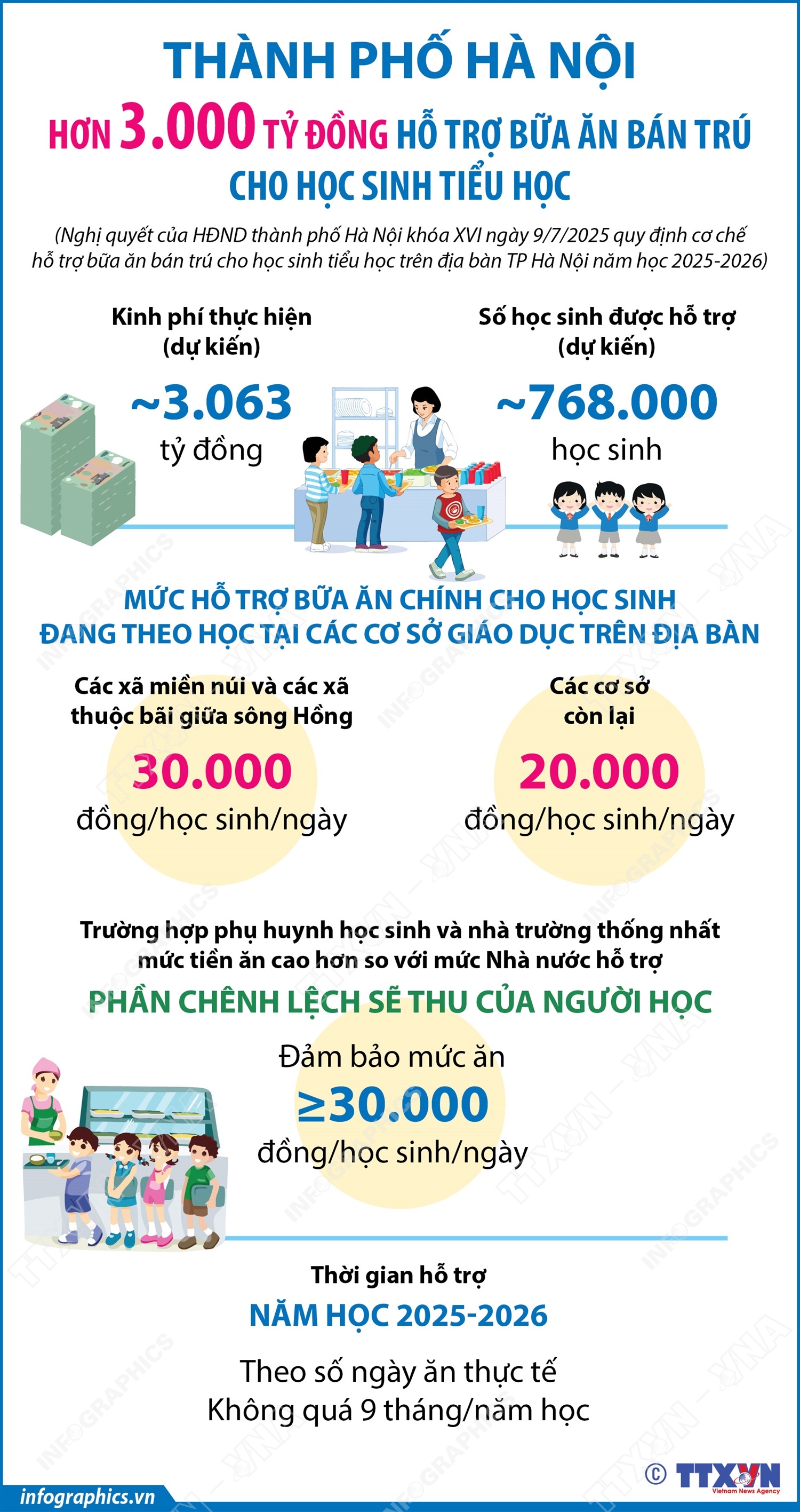 Hà Nội (TTXVN 10/7) Chiều 9/7/2025, HĐND thành phố Hà Nội khóa XVI đã thông qua Nghị quyết quy định cơ chế hỗ trợ bữa ăn bán trú cho học sinh tiểu học trên địa bàn TP Hà Nội năm học 2025-2026. Thời gian hỗ trợ trong năm học 2025-2026, tính theo số ngày ăn thực tế và không quá 9 tháng/năm học. Dự kiến kinh phí thực hiện chính sách hỗ trợ bữa ăn bán trú cho 100% học sinh tiểu học năm học 2025-2026 khoảng 3.063 tỷ đồng. Số đối tượng được hỗ trợ khoảng 768.000 học sinh.