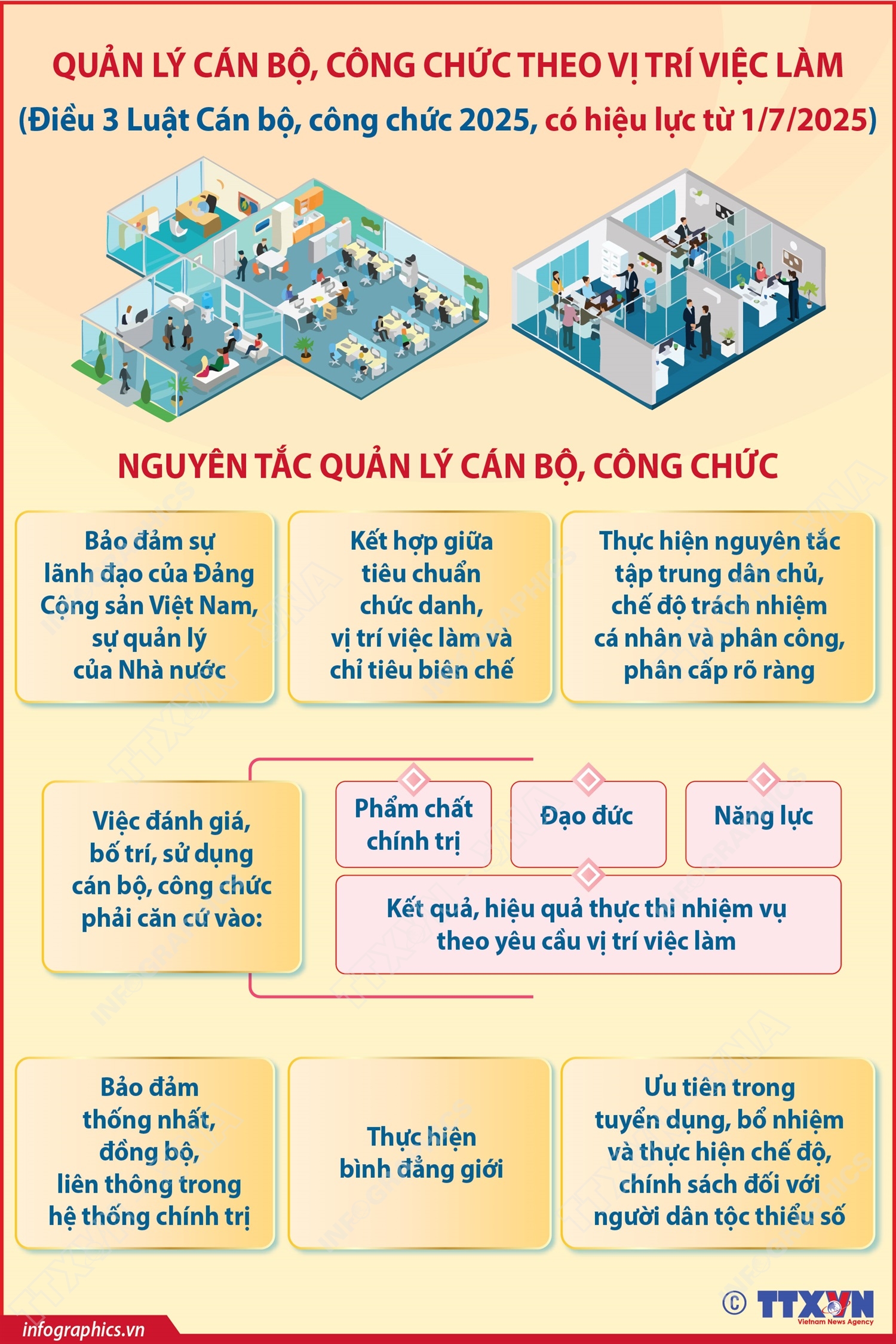 Hà Nội (TTXVN 11/7) Luật Cán bộ, công chức số 80/2025/QH15 của Quốc hội được thông qua ngày 25/6/2025 và chính thức có hiệu lực từ 1/7/2025. Tại Điều 3 Luật Cán bộ, công chức 2025 quy định nguyên tắc quản lý cán bộ, công chức: Bảo đảm sự lãnh đạo của Đảng Cộng sản Việt Nam, sự quản lý của Nhà nước; kết hợp giữa tiêu chuẩn chức danh, vị trí việc làm và chỉ tiêu biên chế; thực hiện nguyên tắc tập trung dân chủ, chế độ trách nhiệm cá nhân và phân công, phân cấp rõ ràng; việc đánh giá, bố trí, sử dụng cán bộ, công chức phải căn cứ vào phẩm chất chính trị, đạo đức, năng lực và kết quả, hiệu quả thực thi nhiệm vụ theo yêu cầu vị trí việc làm….
