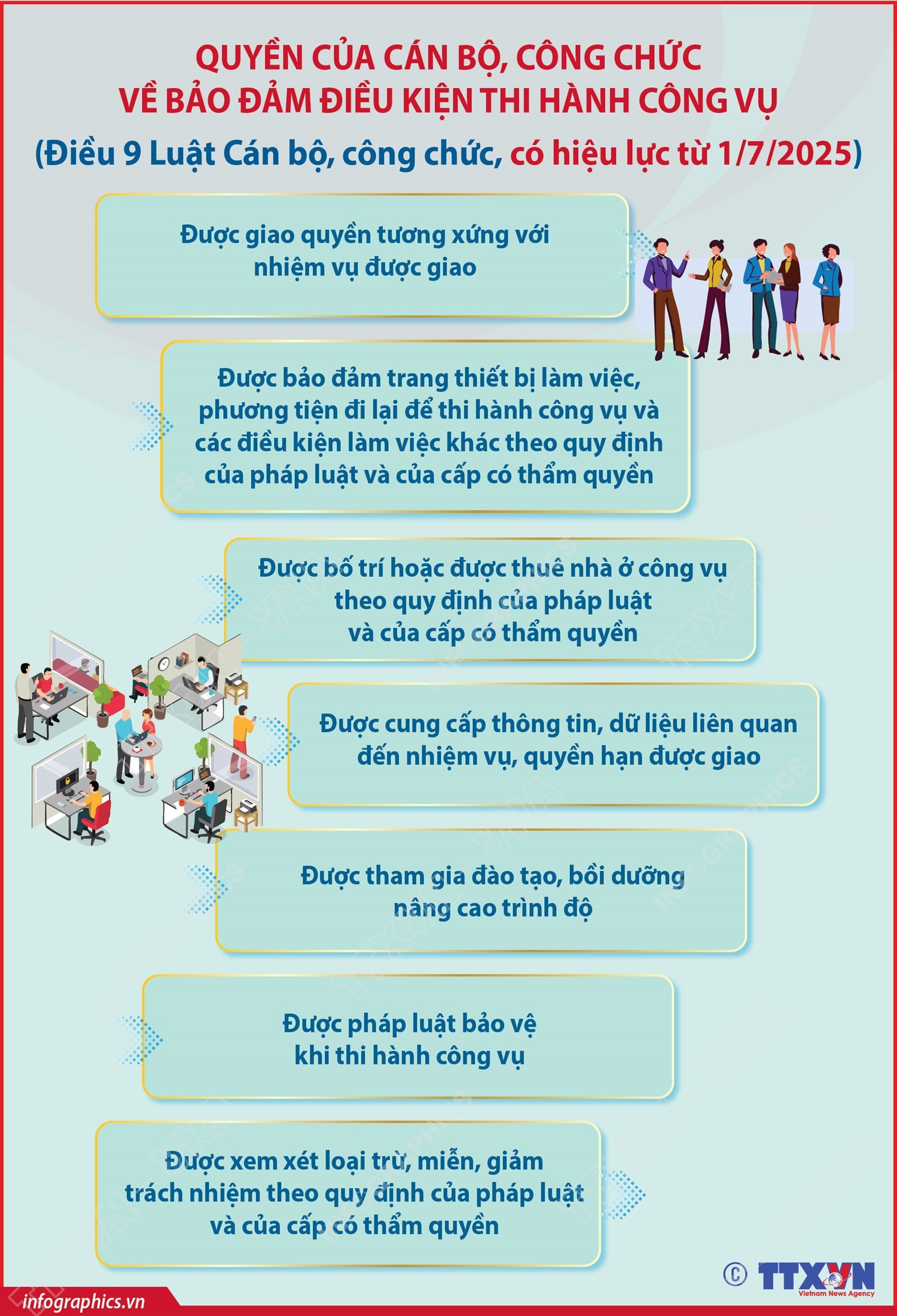 Hà Nội (TTXVN 11/7) Điều 9 Luật Cán bộ, công chức quy định quyền của cán bộ, công chức về bảo đảm điều kiện thi hành công vụ: Được giao quyền tương xứng với nhiệm vụ được giao, Được bảo đảm trang thiết bị làm việc, phương tiện đi lại để thi hành công vụ và các điều kiện làm việc khác theo quy định của pháp luật và của cấp có thẩm quyền, Được bố trí hoặc được thuê nhà ở công vụ theo quy định của pháp luật và của cấp có thẩm quyền…
