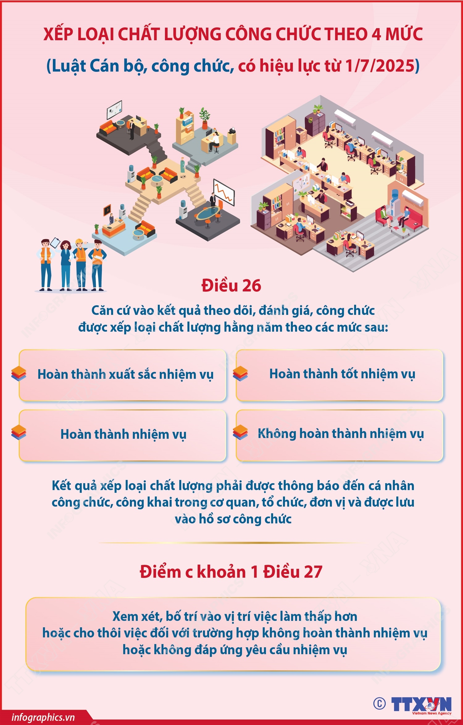 Hà Nội (TTXVN 11/7) Căn cứ vào kết quả theo dõi, đánh giá, công chức được xếp loại chất lượng hằng năm theo 4 mức: Hoàn thành xuất sắc nhiệm vụ; hoàn thành tốt nhiệm vụ; hoàn thành nhiệm vụ và không hoàn thành nhiệm vụ. Kết quả xếp loại chất lượng phải được thông báo đến cá nhân công chức, công khai trong cơ quan, tổ chức, đơn vị và được lưu vào hồ sơ công chức. Trường hợp không hoàn thành nhiệm vụ hoặc không đáp ứng yêu cầu nhiệm vụ, xem xét, bố trí vào vị trí việc làm thấp hơn hoặc cho thôi việc.