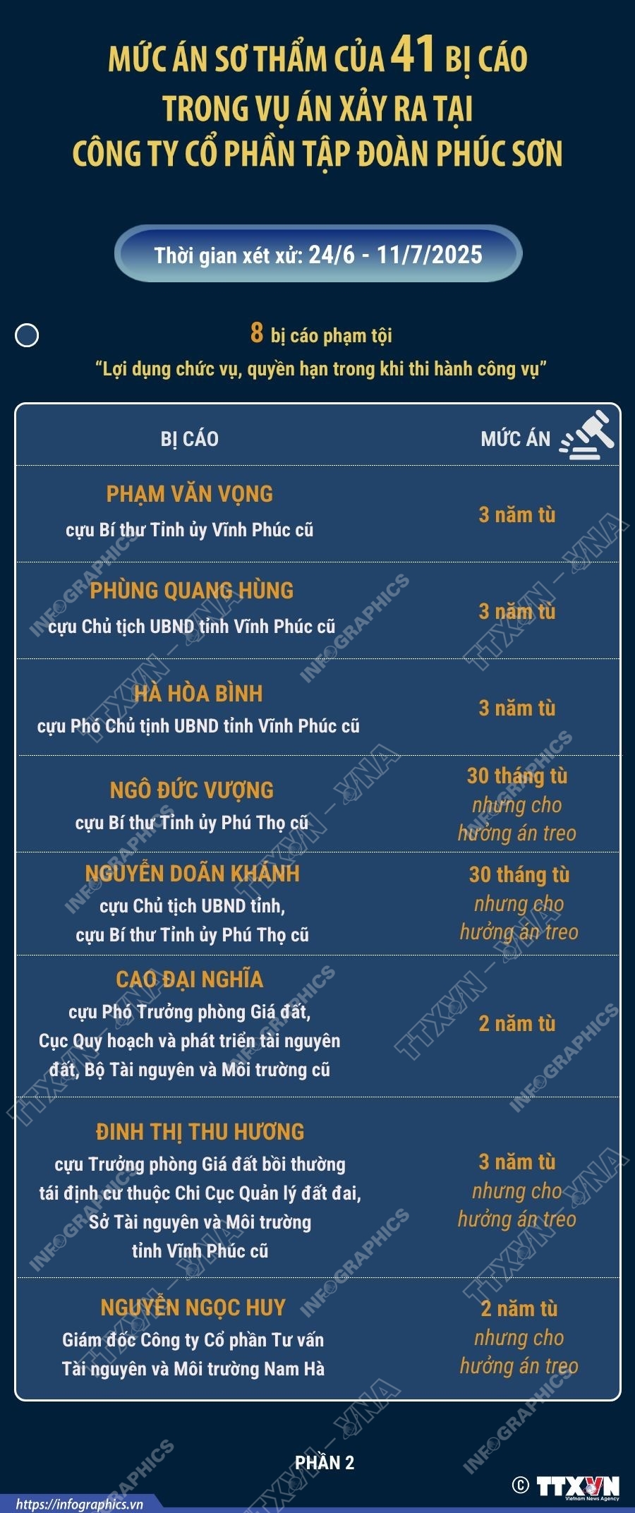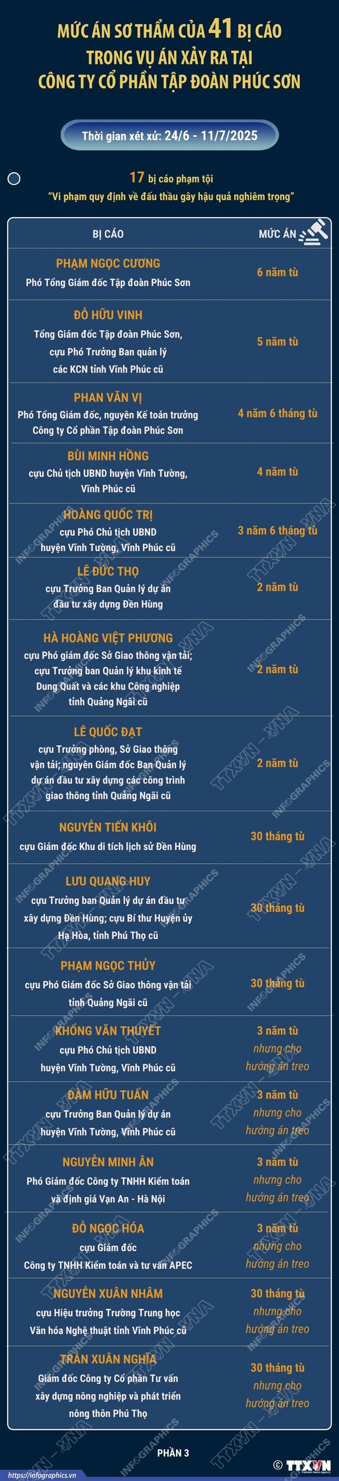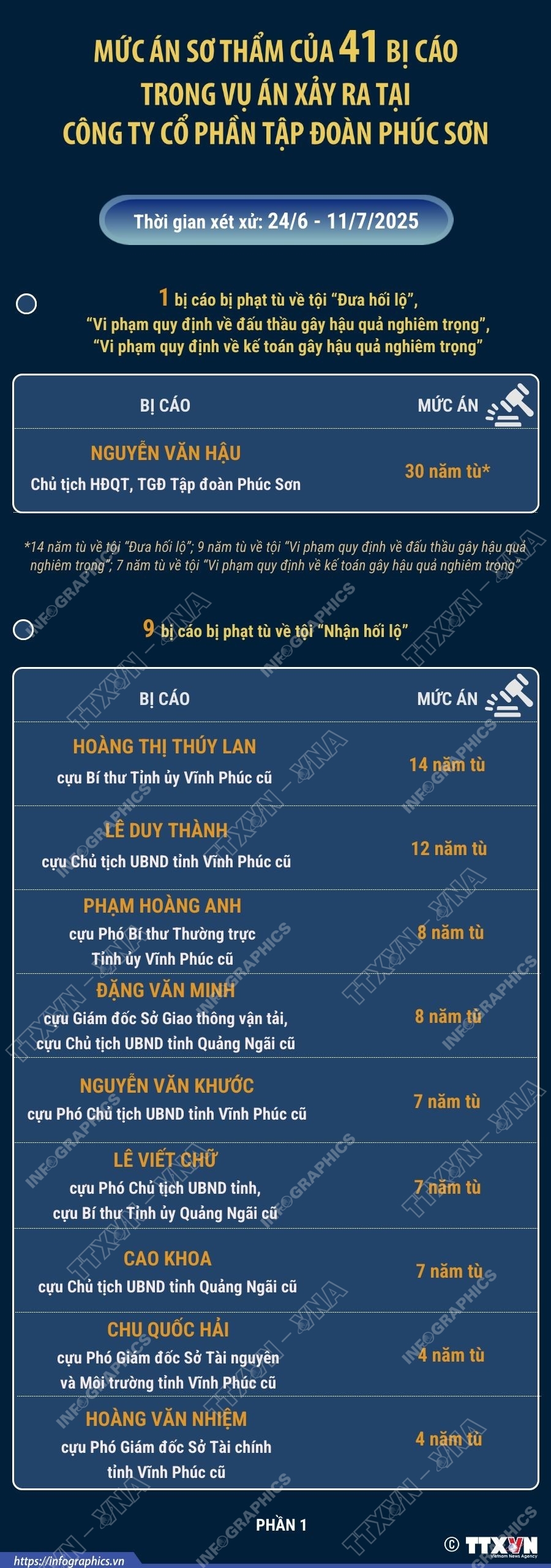 Hà Nội (TTXVN 11/7) Sau 17 ngày xét xử và nghị án, sáng 11/7/2024, Tòa án nhân dân thành phố Hà Nội đã tuyên án đối với 41 bị cáo trong vụ án xảy ra tại Công ty cổ phần Tập đoàn Phúc Sơn (Tập đoàn Phúc Sơn). Tòa đã tuyên án phạt bị cáo Nguyễn Văn Hậu (Chủ tịch Hội đồng quản trị, Tổng Giám đốc Tập đoàn Phúc Sơn) 14 năm tù về tội “Đưa hối lộ”; 9 năm tù về tội “Vi phạm quy định về đấu thầu gây hậu quả nghiêm trọng”; 7 năm tù về tội “Vi phạm quy định về kế toán gây hậu quả nghiêm trọng”. Tổng hợp hình phạt chung của 3 tội đối với bị cáo Hậu là 30 năm tù. Có 9 bị cáo bị phạt tù về tội “Nhận hối lộ”; 8 bị cáo phạm tội “Lợi dụng chức vụ, quyền hạn trong khi thi hành công vụ”; 17 bị cáo phạm tội “Vi phạm quy định về đấu thầu gây hậu quả nghiêm trọng”; 5 bị cáo phạm tội “Vi phạm quy định về kế toán gây hậu quả nghiêm trọng”. Riêng bị cáo Đặng Trung Hoành (cựu Chánh Văn phòng Huyện ủy Mang Thít, Vĩnh Long cũ) bị tuyên phạt 30 tháng tù về tội “Lợi dụng ảnh hưởng đối với người có chức vụ, quyền hạn để trục lợi”.