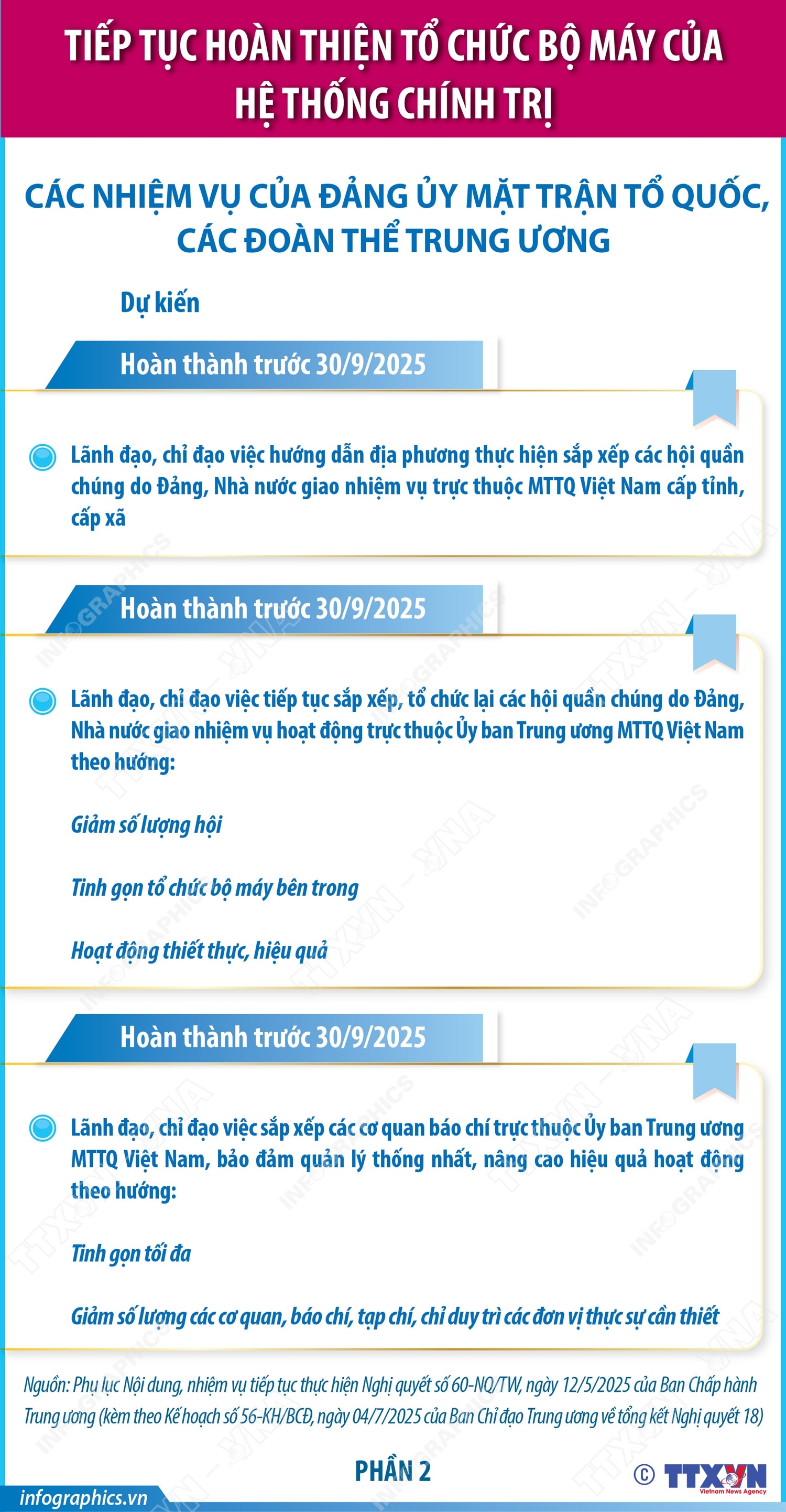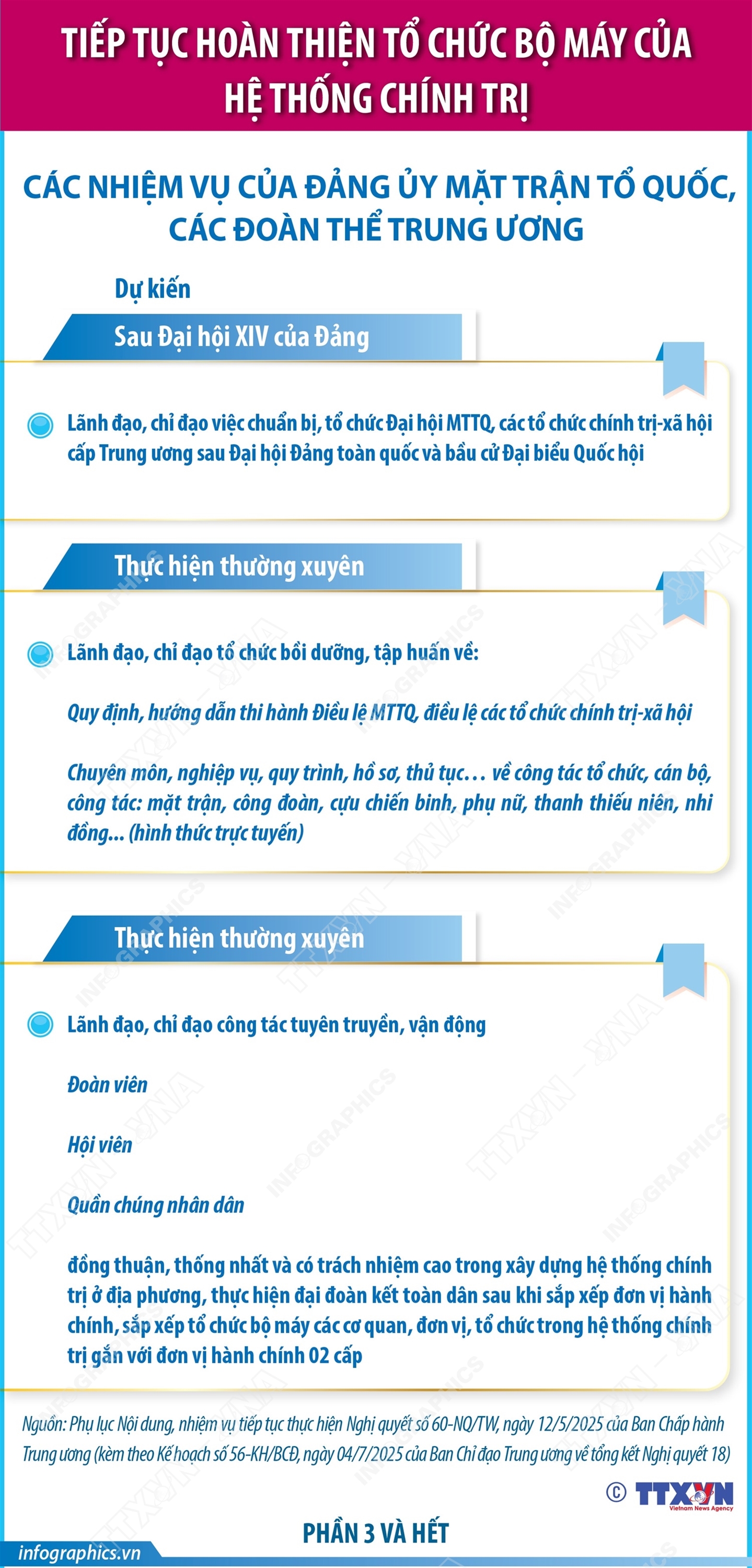Hà Nội (TTXVN 9/7) Thực hiện Nghị quyết số 60-NQ/TW, ngày 12/4/2025 của Ban Chấp hành Trung ương Đảng khóa XIII về tiếp tục sắp xếp tổ chức bộ máy của hệ thống chính trị và các kết luận của Bộ Chính trị, Ban Bí thư; Ban Chỉ đạo Trung ương về tổng kết Nghị quyết 18 ban hành Kế hoạch 56-KH/BCĐ ngày 4/7/2025 tiếp tục hoàn thiện tổ chức bộ máy của hệ thống chính trị và chuẩn bị Đại hội đảng bộ các cấp. Dưới đây là các nhiệm vụ cụ thể của Đảng ủy Mặt trận Tổ quốc, các đoàn thể Trung ương.