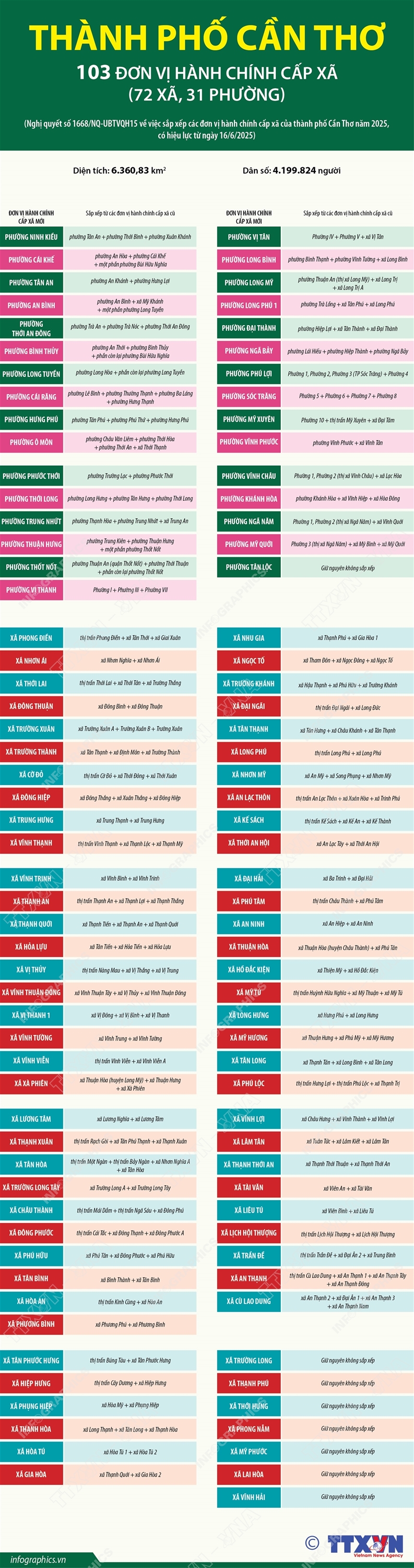 Hà Nội (TTXVN 3/7) Theo Nghị quyết số 1668/NQ-UBTVQH15 ngày 16/6/2025 của Ủy ban Thường vụ Quốc hội, sau khi sắp xếp, thành phố Cần Thơ có 103 đơn vị hành chính cấp xã, gồm 31 phường và 72 xã; trong đó có 30 phường, 65 xã hình thành sau sắp xếp quy định tại Điều này và 08 đơn vị hành chính cấp xã không thực hiện sắp xếp là phường Tân Lộc, các xã Trường Long, Thạnh Phú, Thới Hưng, Phong Nẫm, Mỹ Phước, Lai Hòa, Vĩnh Hải.