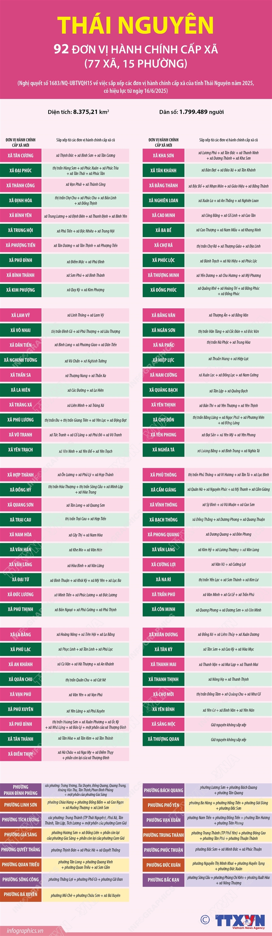 Hà Nội (TTXVN 3/7) Theo Nghị quyết số 1683/NQ-UBTVQH15 ngày 16/6/2025 của Ủy ban Thường vụ Quốc hội, sau khi sắp xếp, tỉnh Thái Nguyên có 92 đơn vị hành chính cấp xã, gồm 77 xã và15 phường; trong đó có 75 xã, 15 phường hình thành sau sắp xếp quy định tại Điều này và 02 xã không thực hiện sắp xếp là xã Sảng Mộc, xã Thượng Quan.