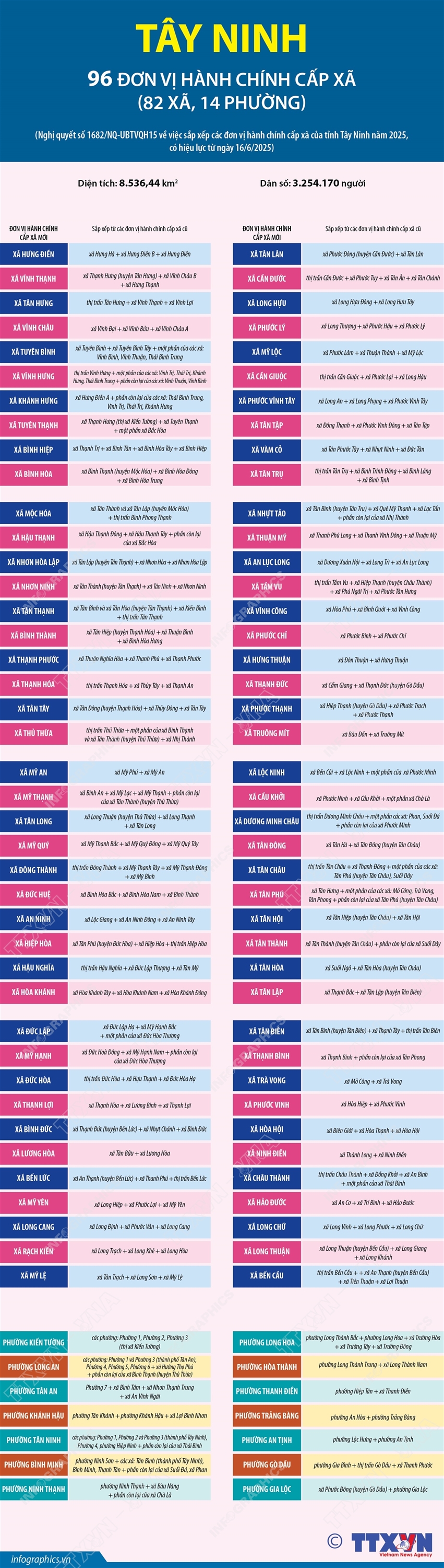 Hà Nội (TTXVN 3/7) Theo Nghị quyết số 1682/NQ-UBTVQH15 ngày 16/6/2025 của Ủy ban Thường vụ Quốc hội, sau khi sắp xếp, tỉnh Tây Ninh có 96 đơn vị hành chính cấp xã, gồm 82 xã và 14 phường.