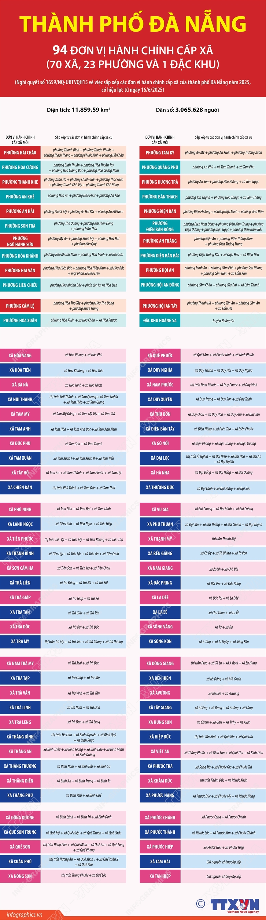 Hà Nội (TTXVN 3/7) Theo Nghị quyết số 1659/NQ-UBTVQH15 ngày 16/6/2025 của Ủy ban Thường vụ Quốc hội, sau khi sắp xếp, thành phố Đà Nẵng có 94 đơn vị hành chính cấp xã; gồm 23 phường, 70 xã và 1 đặc khu.