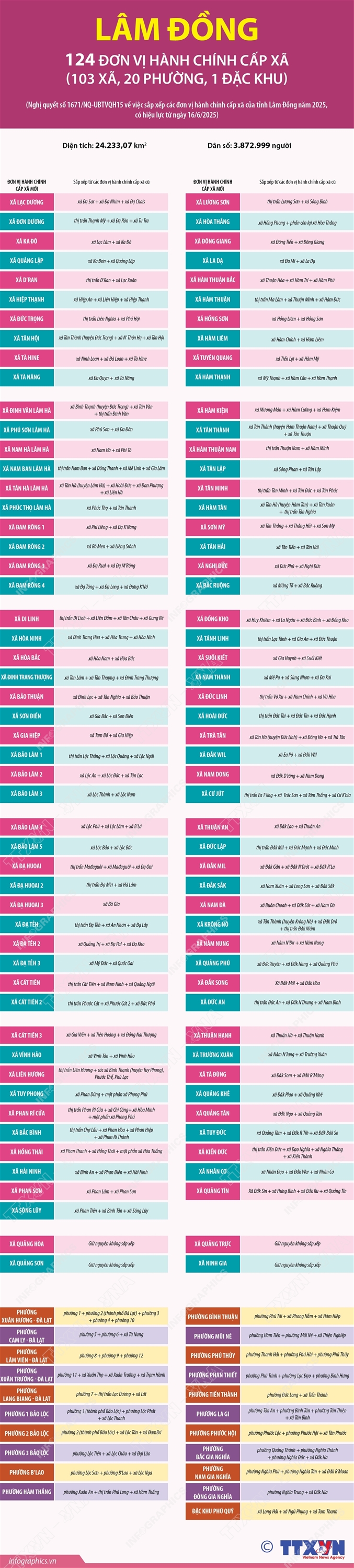Hà Nội (TTXVN 3/7) Theo Nghị quyết số 1671/NQ-UBTVQH15 ngày 16/6/2025 của Ủy ban Thường vụ Quốc hội, sau khi sắp xếp, tỉnh Lâm Đồng có 124 đơn vị hành chính cấp xã; gồm 103 xã, 20 phường và 1 đặc khu.