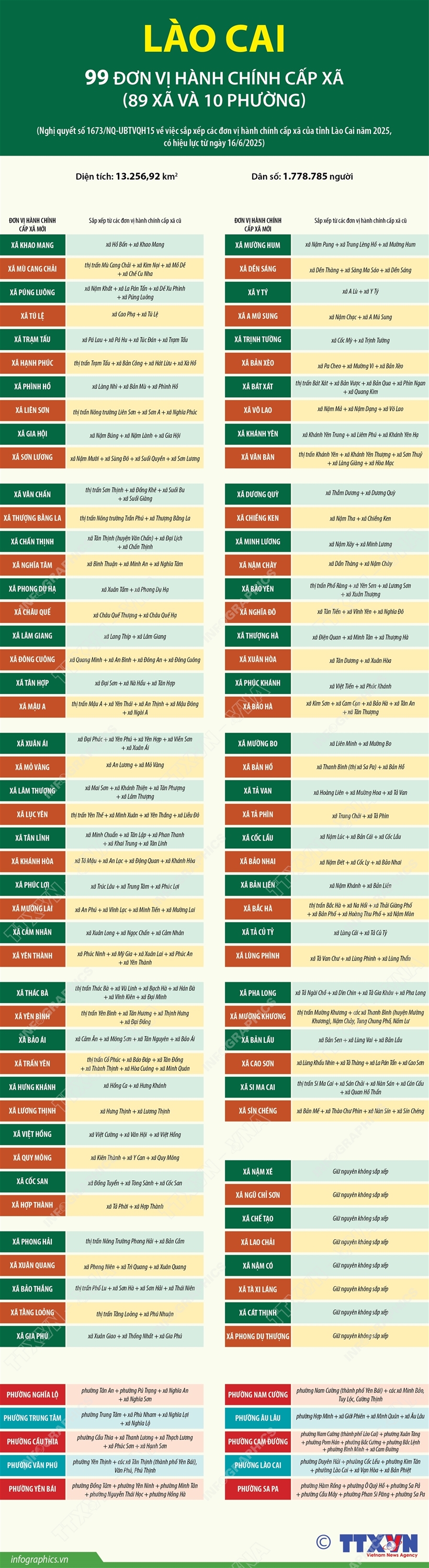 Hà Nội (TTXVN 3/7) Theo Nghị quyết số 1673/NQ-UBTVQH15 ngày 16/6/2025 của Ủy ban Thường vụ Quốc hội, sau khi sắp xếp, tỉnh Lào Cai có 99 đơn vị hành chính cấp xã, gồm 89 xã và 10 phường.