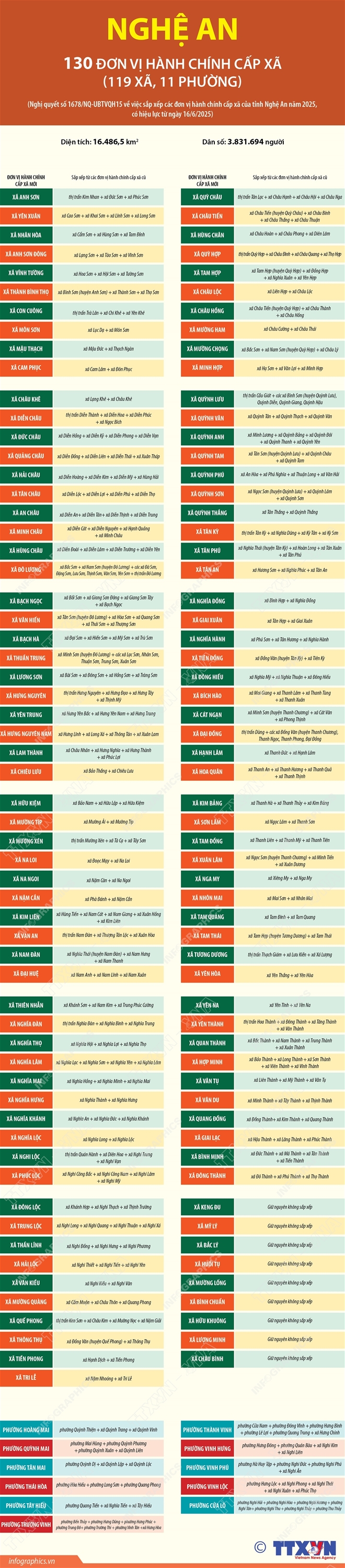 Hà Nội (TTXVN 3/7) Theo Nghị quyết số 1678/NQ-UBTVQH15 ngày 16/6/2025 của Ủy ban Thường vụ Quốc hội, sau khi sắp xếp, tỉnh Nghệ An có 130 đơn vị hành chính cấp xã, gồm 119 xã và 11 phường.