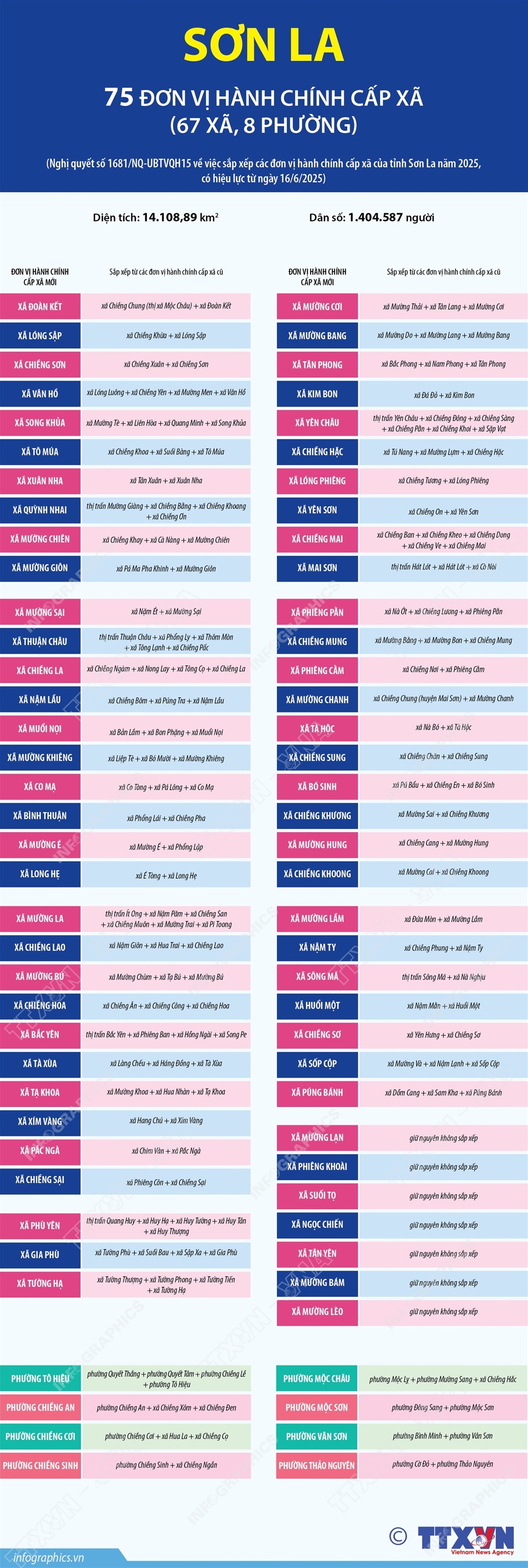 Hà Nội (TTXVN 4/7) Theo Nghị quyết số 1681/NQ-UBTVQH15 ngày 16/6/2025 của Ủy ban Thường vụ Quốc hội, sau khi sắp xếp, tỉnh Sơn La có 130 đơn vị hành chính cấp xã, gồm 119 xã và 11 phường