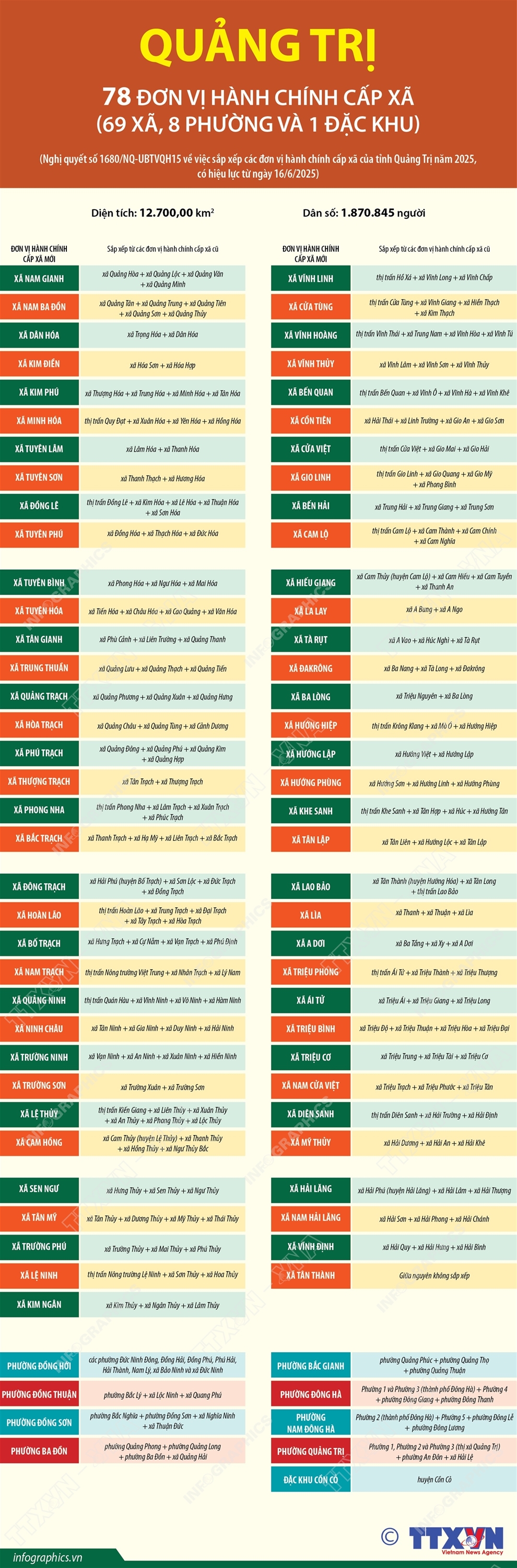 Hà Nội (TTXVN 4/7) Theo Nghị quyết số 1680/NQ-UBTVQH15 ngày 16/6/2025 của Ủy ban Thường vụ Quốc hội, sau khi sắp xếp, tỉnh Quảng Trị có 130 đơn vị hành chính cấp xã, gồm 119 xã và 11 phường.