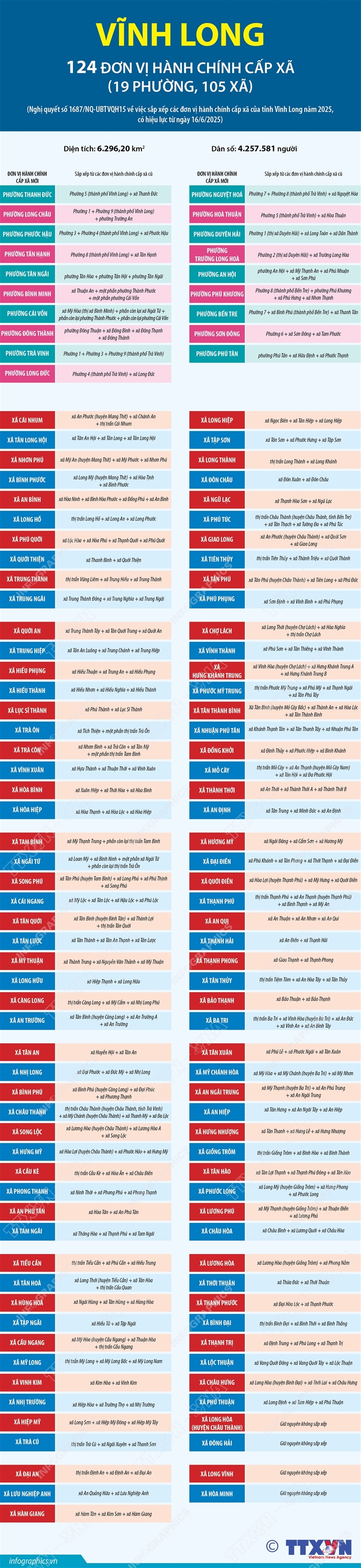 Hà Nội (TTXVN 4/7) Theo Nghị quyết số 1687/NQ-UBTVQH15 ngày 16/6/2025 của Ủy ban Thường vụ Quốc hội, sau khi sắp xếp, tỉnh Vĩnh Long có 124 đơn vị hành chính cấp xã, gồm 105 xã và 19 phường.