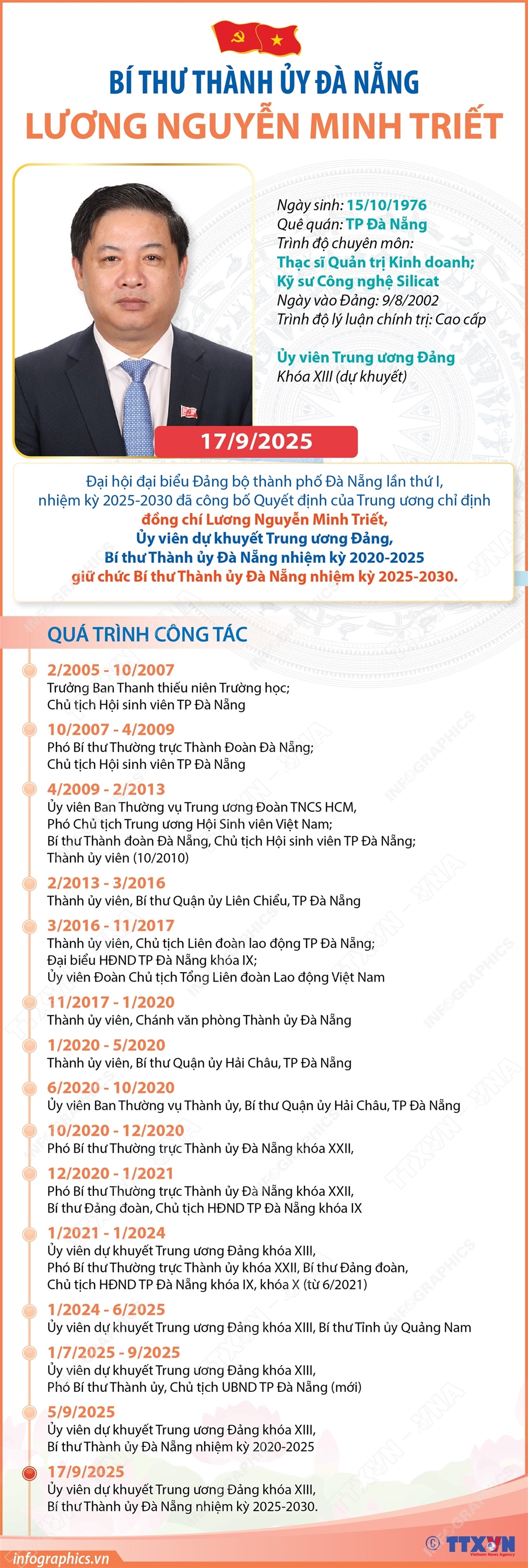 Hà Nội (TTXVN 17/9) Ngày 17/9/2025, Đại hội đại biểu Đảng bộ thành phố Đà Nẵng lần thứ I, nhiệm kỳ 2025-2030 đã công bố Quyết định của Trung ương về việc chỉ định Ban Chấp hành, Ban Thường vụ, Bí thư, Phó Bí thư, Ủy ban Kiểm tra, Chủ nhiệm, Phó Chủ nhiệm Ủy ban Kiểm tra Thành ủy Đà Nẵng khóa I, nhiệm kỳ 2025-2030. Đồng chí Lương Nguyễn Minh Triết, Ủy viên dự khuyết Trung ương Đảng, Bí thư Thành ủy Đà Nẵng nhiệm kỳ 2020-2025 được chỉ định giữ chức Bí thư Thành ủy Đà Nẵng nhiệm kỳ 2025-2030.