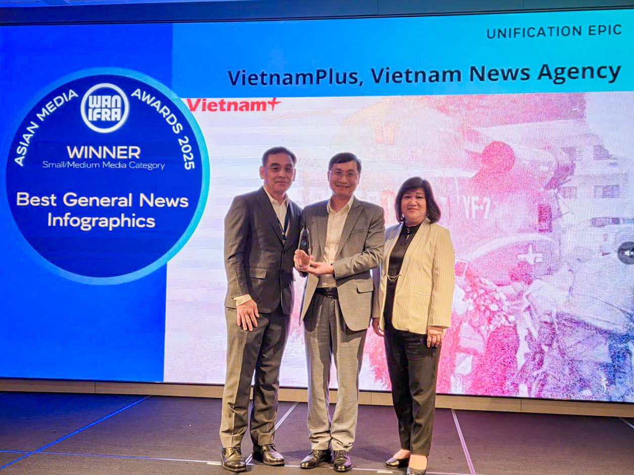 Ngày 5/11, tác phẩm “Hùng ca thống nhất đất nước” của Báo điện tử VietnamPlus thuộc Thông tấn xã Việt Nam (TTXVN) được trao giải thưởng “Đồ họa Tin tức Tổng hợp Tốt nhất” (Best General News Infographics) thuộc hạng mục “Đồ họa” (Infographics) trong khuôn khổ Hội nghị Thượng đỉnh Lãnh đạo Truyền thông Châu Á (The Asian Media Leaders Summit - AMLS) lần thứ 5 do Hiệp hội các nhật báo và nhà xuất bản tin tức Thế giới (WAN-IFRA) tổ chức tại Singapore.