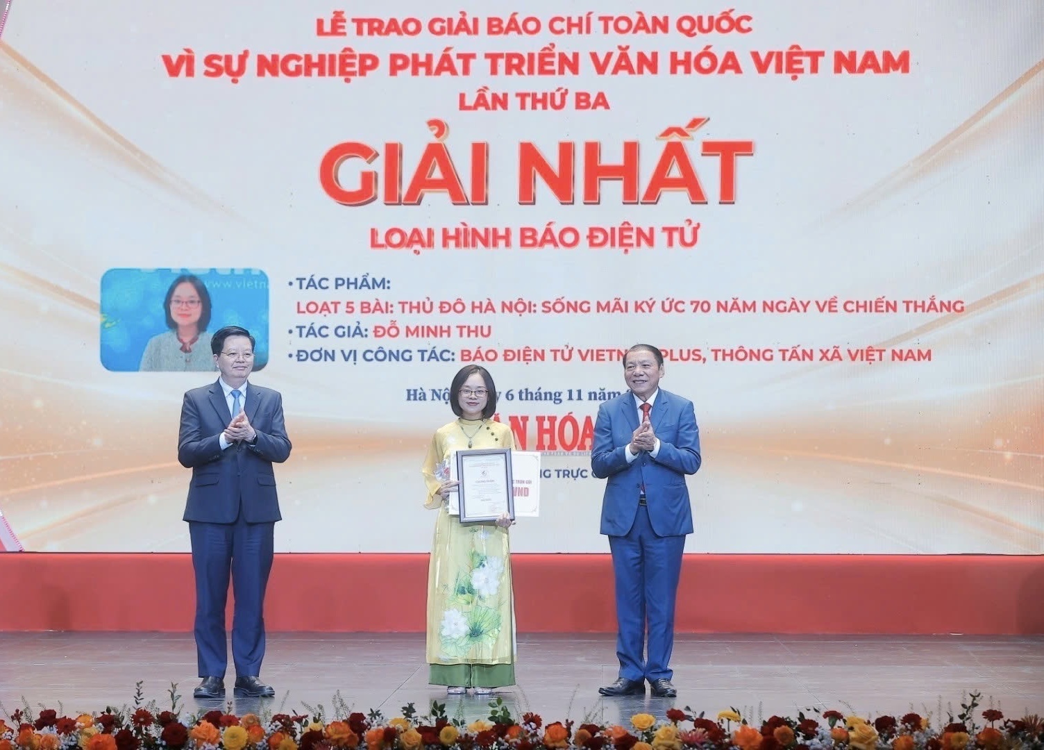 Tối 6/11, tại Lễ trao Giải Báo chí toàn quốc “Vì sự nghiệp phát triển Văn hóa Việt Nam” lần thứ ba do Bộ Văn hóa, Thể thao và Du lịch phối hợp với Ban Tuyên giáo và Dân vận Trung ương, Hội Nhà báo Việt Nam tổ chức, Thông tấn xã Việt Nam (TTXVN) được trao 10 giải thưởng gồm: 1 giải Nhất, 2 giải Nhì, 2 giải Ba và 5 giải Khuyến khích.