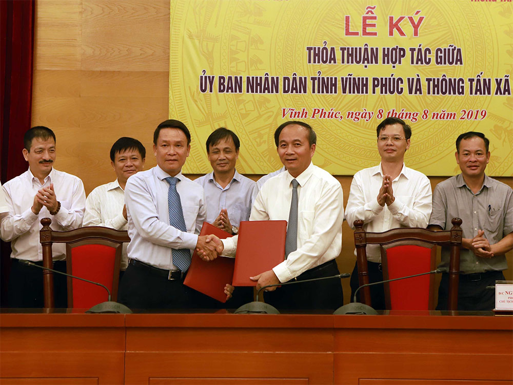 Thỏa thuận hợp tác truyền thông giữa Thông tấn xã Việt Nam (TTXVN) và Ủy ban nhân dân (UBND) tỉnh Vĩnh Phúc nhằm tăng cường thông tin, quảng bá kịp thời, toàn diện, sâu sắc những thành tựu nổi bật của tỉnh Vĩnh Phúc giai đoạn 2019-2020 được ký kết chiều 8/8, tại thành phố Vĩnh Yên.