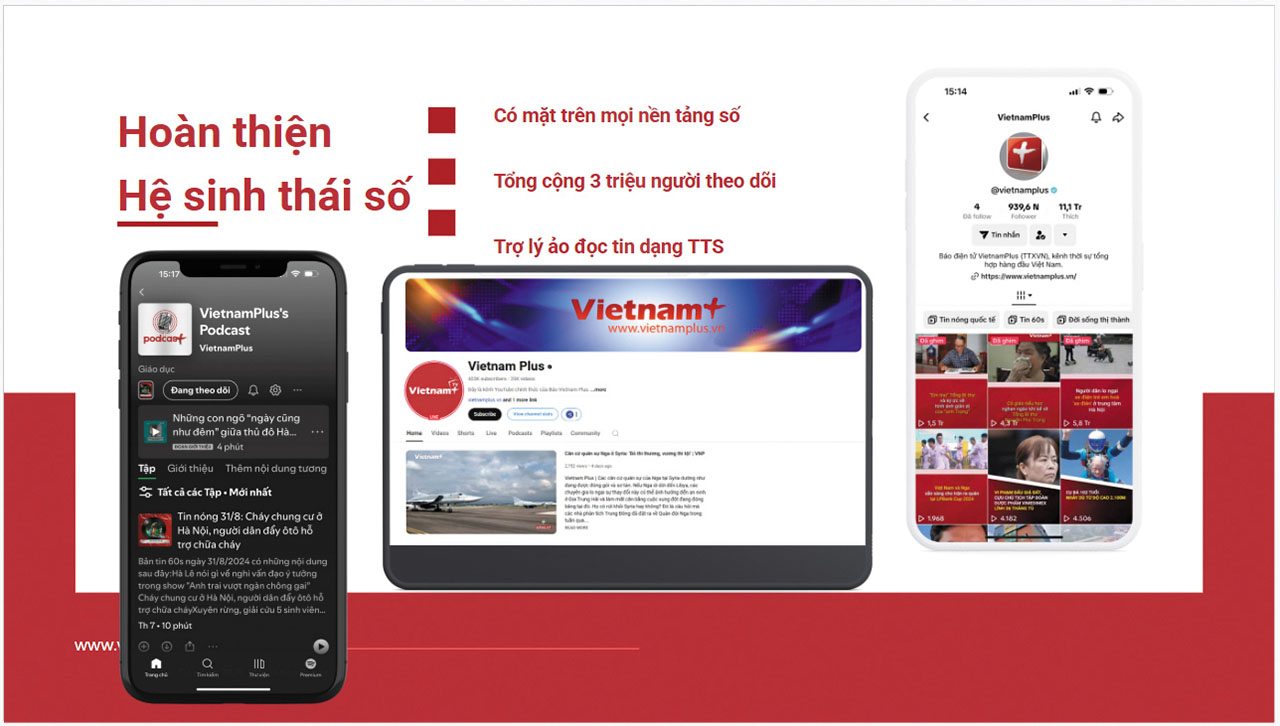 6. Chuyển đổi số toàn diện, ứng dụng công nghệ và trí tuệ nhân tạo trong chỉ đạo điều hành, sản xuất và phân phối thông tin; mở rộng Trung tâm Dữ liệu (Data Center); nâng cấp các kênh thông tin theo xu hướng chuyển đổi số và đa nền tảng. Báo điện tử VietnamPlus và báo Tin tức lọt top 10 cơ quan báo chí chuyển đổi số đạt mức xuất sắc.